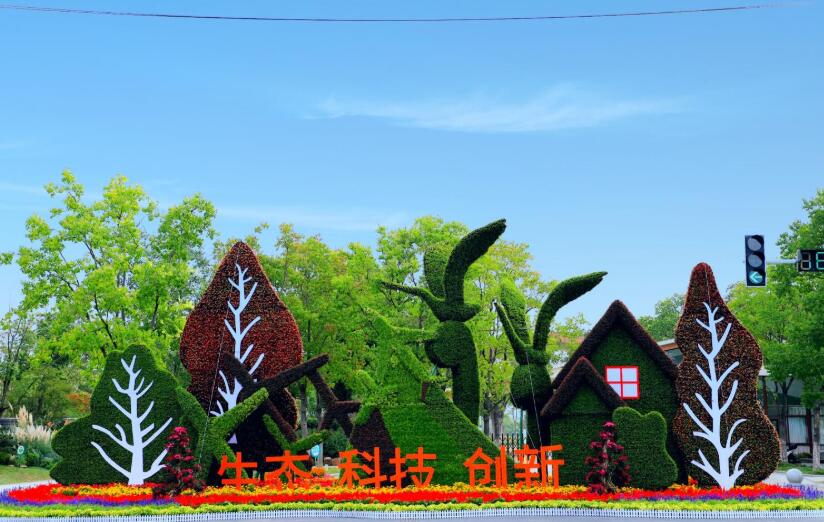 此次花展位于南艳湖公园西门入口处,花境位于西门门路两侧及园区内部部分景点。来到南艳湖公园西门门口,映入眼帘的是一个长18米,高8米的主题花展,“生态·科技·创新”6个字分别代表生态公园、科技小镇、创新发展,进入公园,道路两侧的串红、万寿菊、百日草、海棠、牵牛,各种花卉争奇斗艳。