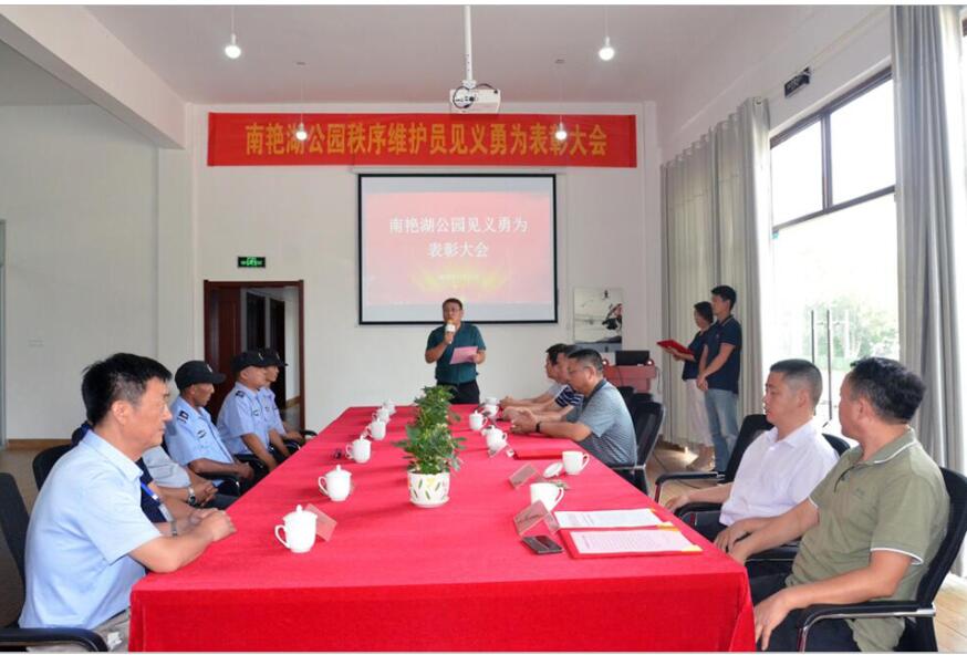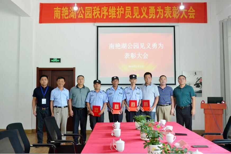 7月11日下午,公用公司在南艳湖公园召开南艳湖公园秩序维护员见义勇为表彰大会,为勇救南艳湖两落水女孩的4名秩序维护员进行表彰、颁奖。区城管局局长赵志刚、副局长钟俊明,公用公司总经理李茂茂等出席会议。