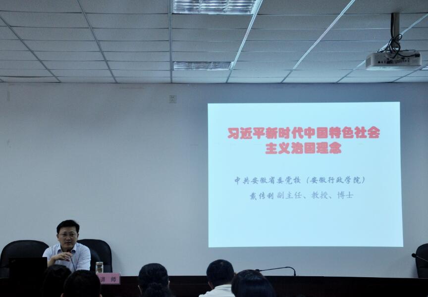 省委党校政治部副主任、教授、博士戴传利应邀作了“新时代中国特色社会主义治国理念”主题讲座,从以“坚持和发展中国特色社会主义”为主线、“以人民为中心、人民当家作主”为使命、“实现中华民主伟大复兴的中国梦”为目标、“世情、党情、国情”为依据、“协调推进‘四个全面’战略布局”为方法等五个方面阐述了习近平新时代中国特色社会主义思想的发展脉络。