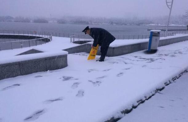 在安全防范方面,划定区域,责任到人。在相关地段放置“警示牌”,增强游客安全意识;加大安保人员巡逻频率,减少安全隐患发生;在知晓雪后严寒天气来临,对园区水管及设施采取保护措施,特别对便池冲水管及面盆上水管包裹保温棉,预防低温导致水管破裂。园内老旧的电线杆因受力原因断裂倒塌,影响部分区域路灯不亮,园区管理人员配合管养部路灯项目组及时抢修,24小时内更换电线杆及设施设备,恢复园区供电。