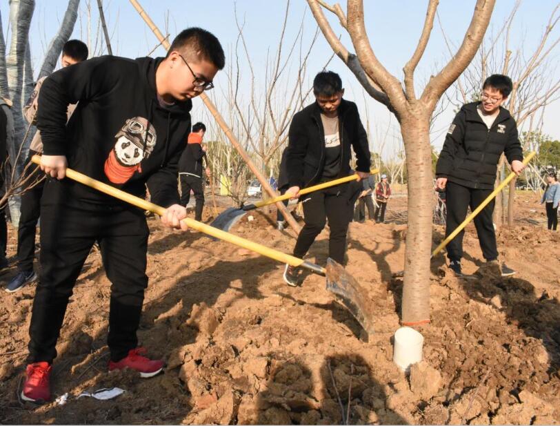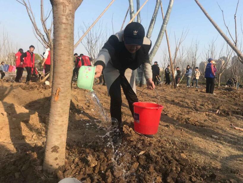 3月12日,在翡翠湖风景区,来了一群年轻的“环保卫士”,各个手拿铁锹、水桶,为新种植的日本晚樱进行固定、填土、浇水。他们是来自安徽大学和合肥工业大学的学生。正在开展校地共建翡翠湖“绿色后花园”活动。