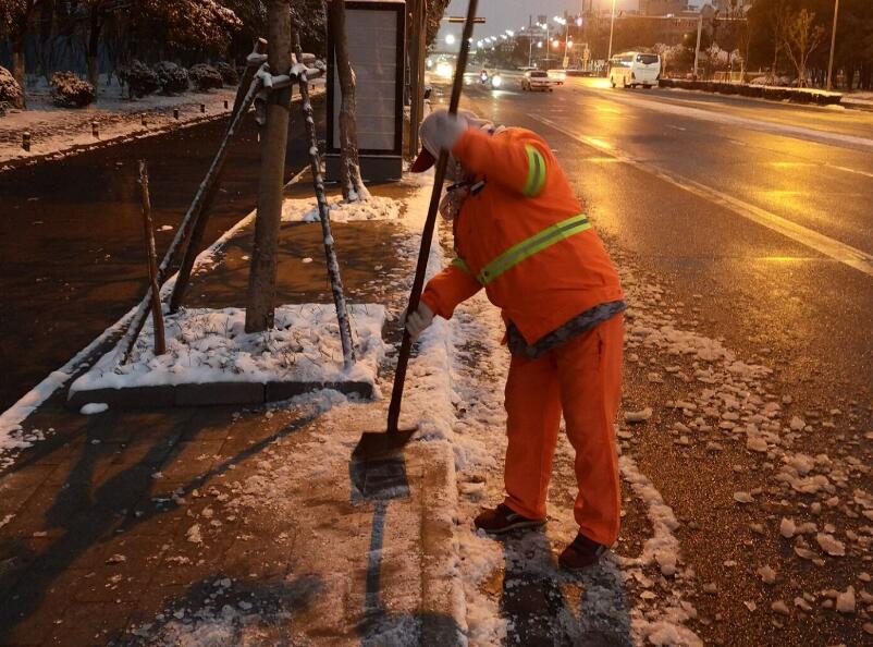 我区紫云路和始信路的人行天桥上,3名环卫工人带着手套,手持铁锹,分组对人行天桥桥面进行铲雪除冰作业。为了防止气温过低,桥面水渍结冰环卫工人还在人行天桥铺上了防滑垫和警示锥并在结冰较为严重的桥面适量泼洒融雪剂在天门湖公租房,物业管理处一方面正冒着风雪对过往车辆、人员进行登记和体温检测,另一方面投入人员铺设防滑垫、泼洒融雪剂,开展铲雪除冰作业,保障公租房内部道路通畅;在紫云花园小区,针对疫情防控期间小区少量居民翻越围墙进出的现象,物业管理处在完成了铲雪除冰作业后,还冒雪使用200余米刺丝对小区围挡缺口进行封闭,并装订了5块安全提示牌……