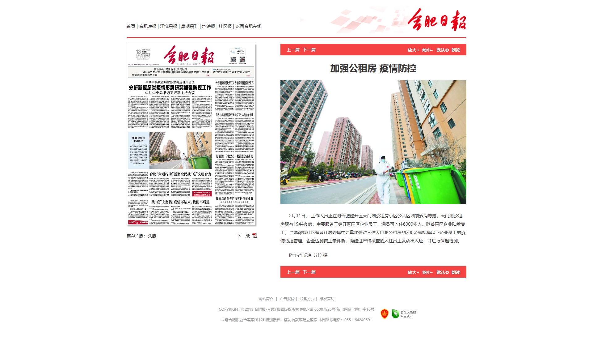 合肥日报:加强公租房 疫情防控http://newspaper.hf365.com/hfrb/pc/content/202002/13/content_146033.html