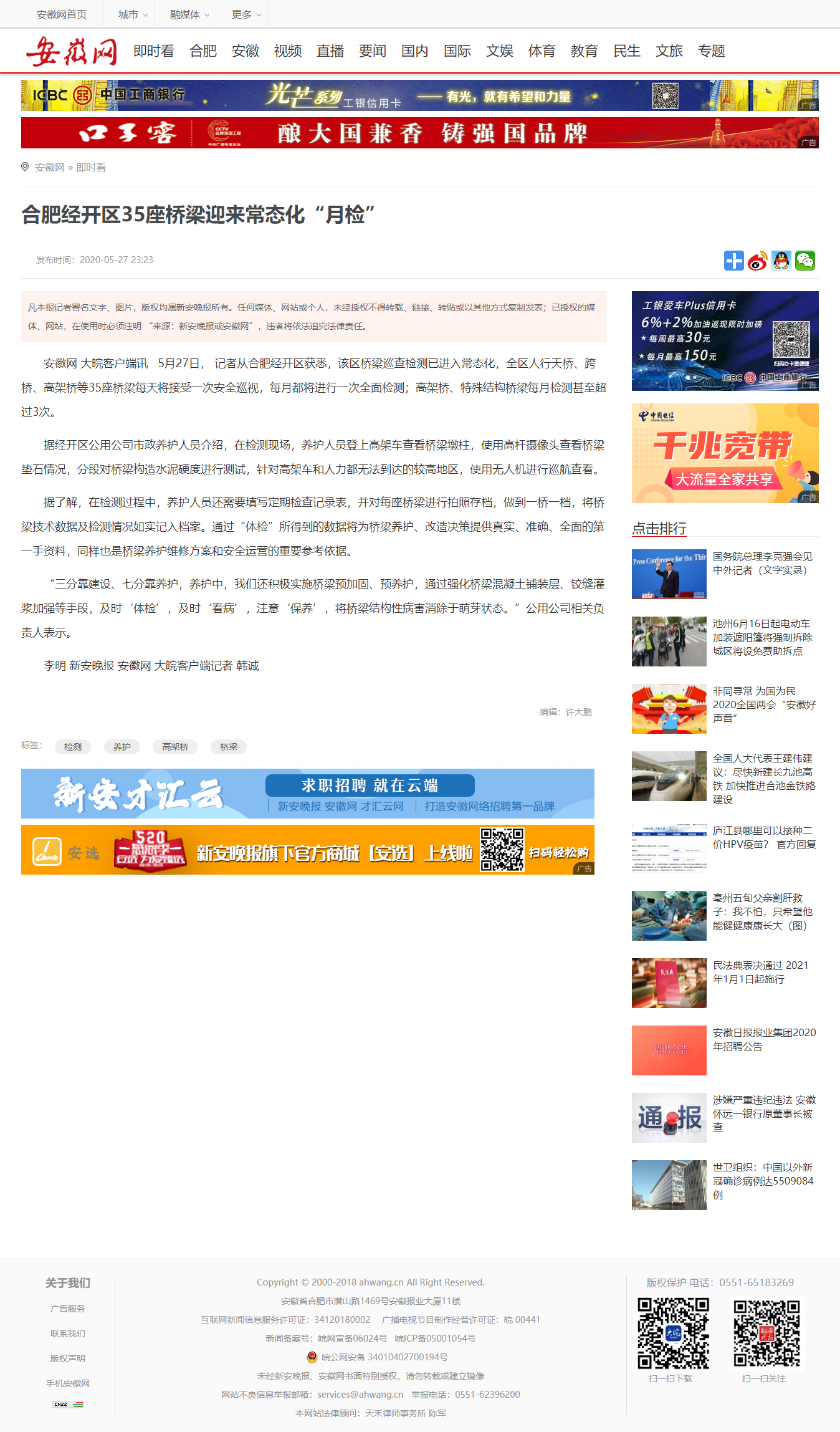 安徽网:合肥经开区35座桥梁将迎来常态化“月检”:http://www.ahwang.cn/newsflash/20200527/2071793.html