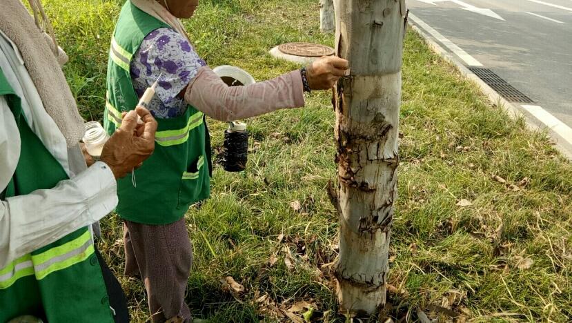 在北区行道绿化树虫害防治过程中,空港分公司选择了具有触杀和内吸作用的药物进行防治,并采用了“先清虫,后施药”的防治方法,先用铁丝、镊子等工具将虫洞内的幼虫及排泄物清掏干净,再用注射器将药物注射进虫洞内,最后用泥巴将虫洞封住。此类防治方法可以充分消杀病虫害幼虫,达到理想的防治效果。目前空港分公司正在进行第二轮病虫害防治工作,保障北区绿化苗木的健康成长。