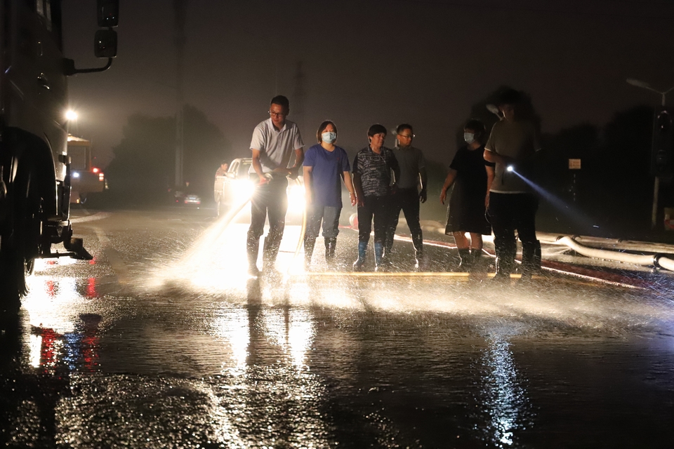 截止7月18日,蓬莱路与云谷路交口汛情依旧严重,现场,公司泵站、截流闸管理人员、下穿桥、积涝点值守人员等百余名应急人员拉起警戒线,立起反光锥,出动应急车。倾盆暴雨中,应急保障人员坚守一线;马达轰鸣中,多台泵机昼夜不停紧急排涝;灯光汇聚处,河道巡查、应急抢险不断,一场防汛抗洪保卫战在漫漫长夜中拉开序幕。