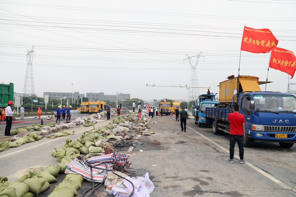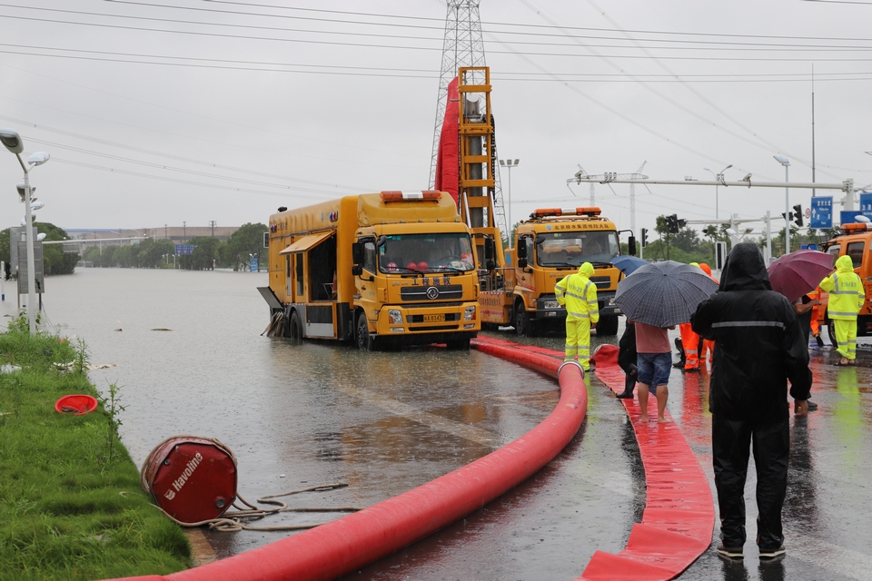 面对严峻的防汛形势,公司科学调度,继续强化措施,迅速进入临战状态。在抢险现场,利用高架车架设照明灯,防汛抗洪应急指挥部昼夜值班,应急保障队伍全部到岗到位,备齐防汛物资,吹响防汛救灾的战斗号角。面对洪流,最后的堤坝,依旧是人堤,公司动用全部应急救援力量,总人数达到600余人,60余台巡查车、吸水车全部上路、支援处置积水险情,紧急启动2台移动泵车与1台移动泵站全力排水。