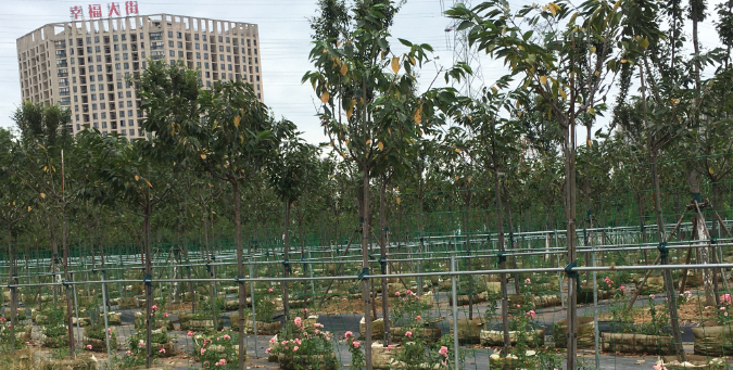 汤口路苗圃是以汤口路为界分南北两个部分。南侧苗圃以储存、培育地栽苗木为主,主要品种有晚樱、紫薇、单杆红叶石楠、红榉等苗木;北侧为新建苗圃基地,主要以培育容器苗木为主,主要品种有红橡、阳光樱、高杆桂花、豆梨等。容器栽植作为新栽植方式,其具有苗木出圃方便,移植成活率高、移植可以保持原有的苗木冠型等优点,后期将继续培育花境材料容器苗。