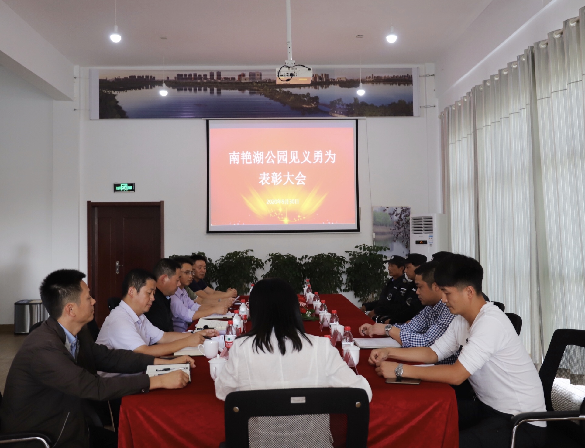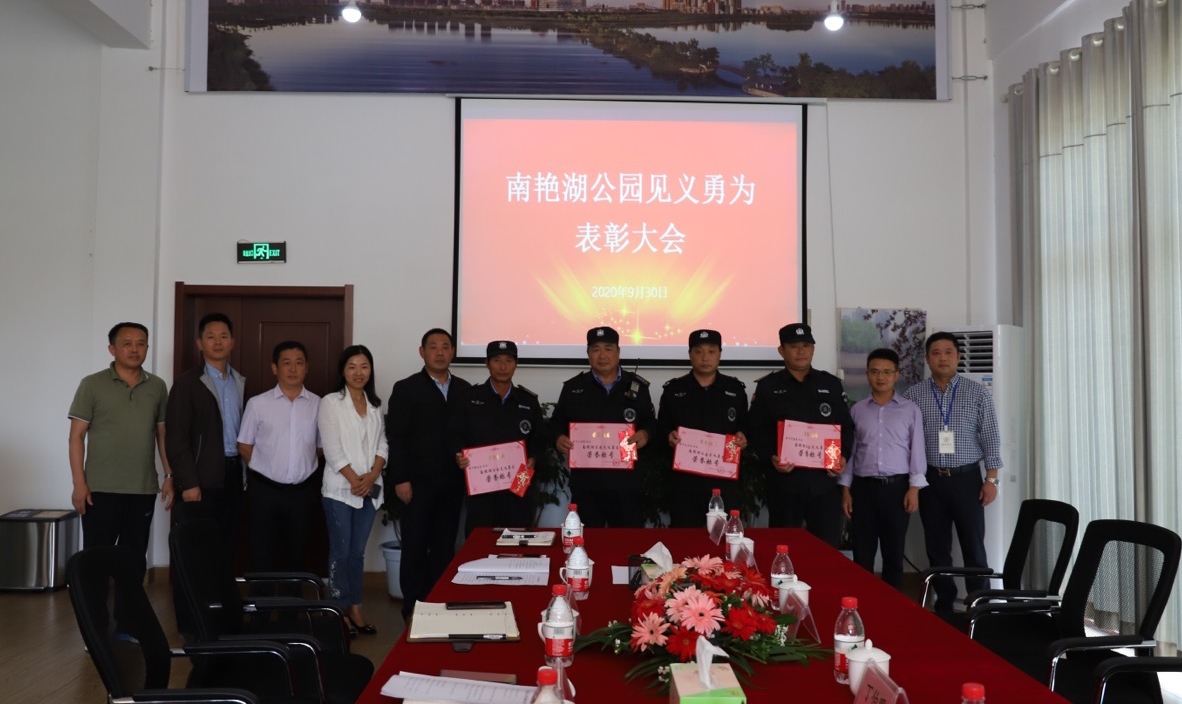 9月30日下午,公用公司在南艳湖公园管理处服务中心召开秩序维护员见义勇为表彰大会,为勇救南艳湖轻生女游客的4名秩序维护员进行表彰、颁奖。区城管局副局长钟俊明、绿化处处长罗振,公用公司副总经理卢钟毓、市政园林中心副主任刘磊等相关人员出席。