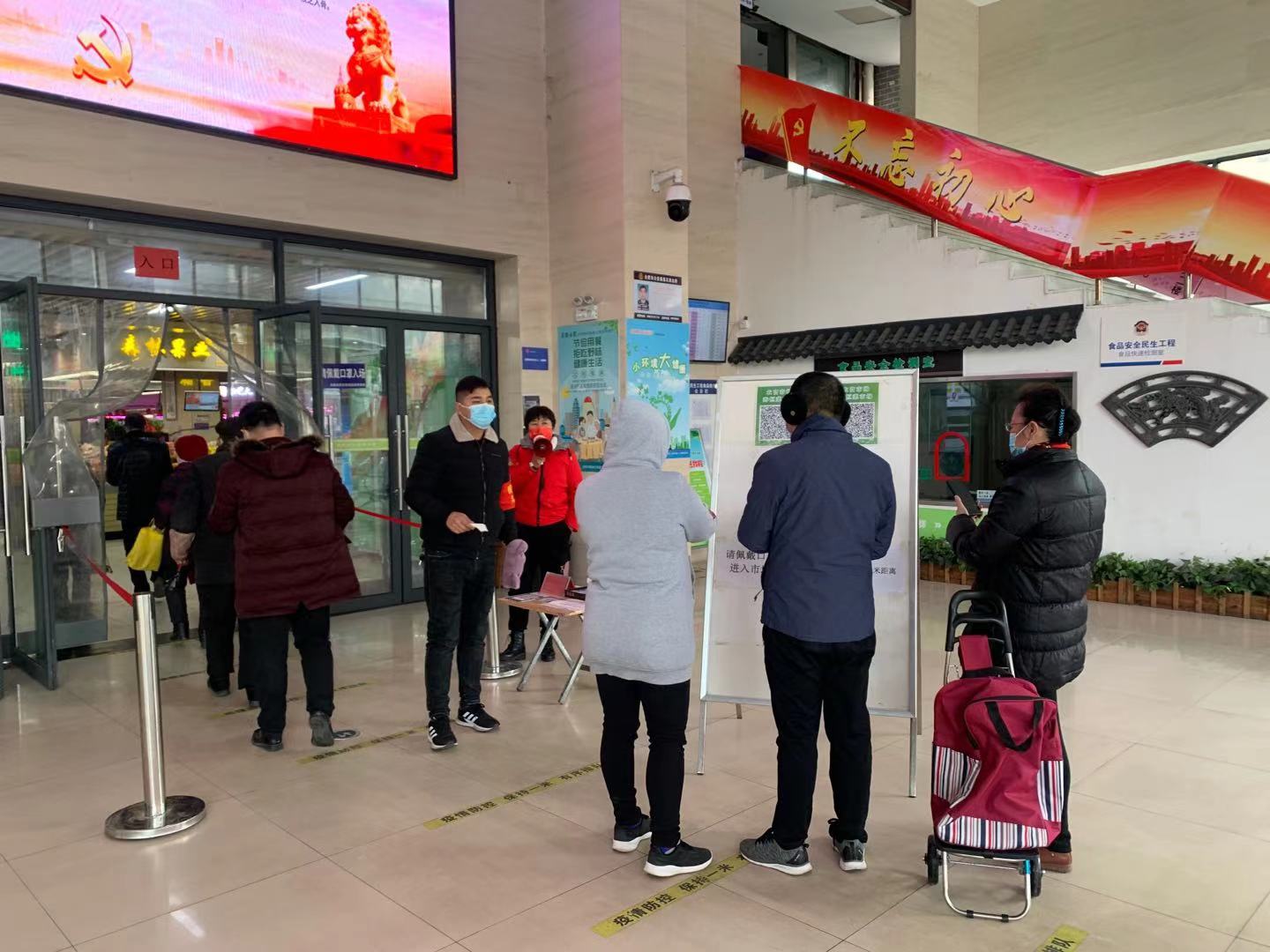 菜市场严格落实主管责任,紧盯关键环节,补齐短板弱项,严格落实“五个一律”:市场内加强通风、消杀;出入口及公用卫生间配备洗手液;市场内工作人员及经营户一律佩戴口罩并进行健康登记,巡查人员不定时巡查市场内不佩戴口罩等不规范行为;市场出入口严格落实测体温、扫安康码,同时通过广播、电子显示屏等形式不间断进行疫情防控知识宣传;各菜市场每日做好外来人员及工作人员健康、索证索票、消杀、经营户冷链食品销售等各类登记,同时每日将各菜市场运营情况按时上报,做好联防联控。