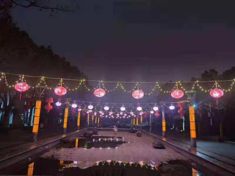 大红灯笼高高挂,张灯结彩迎新春,两湖公园友敞大门,同心喜迎八方游客。