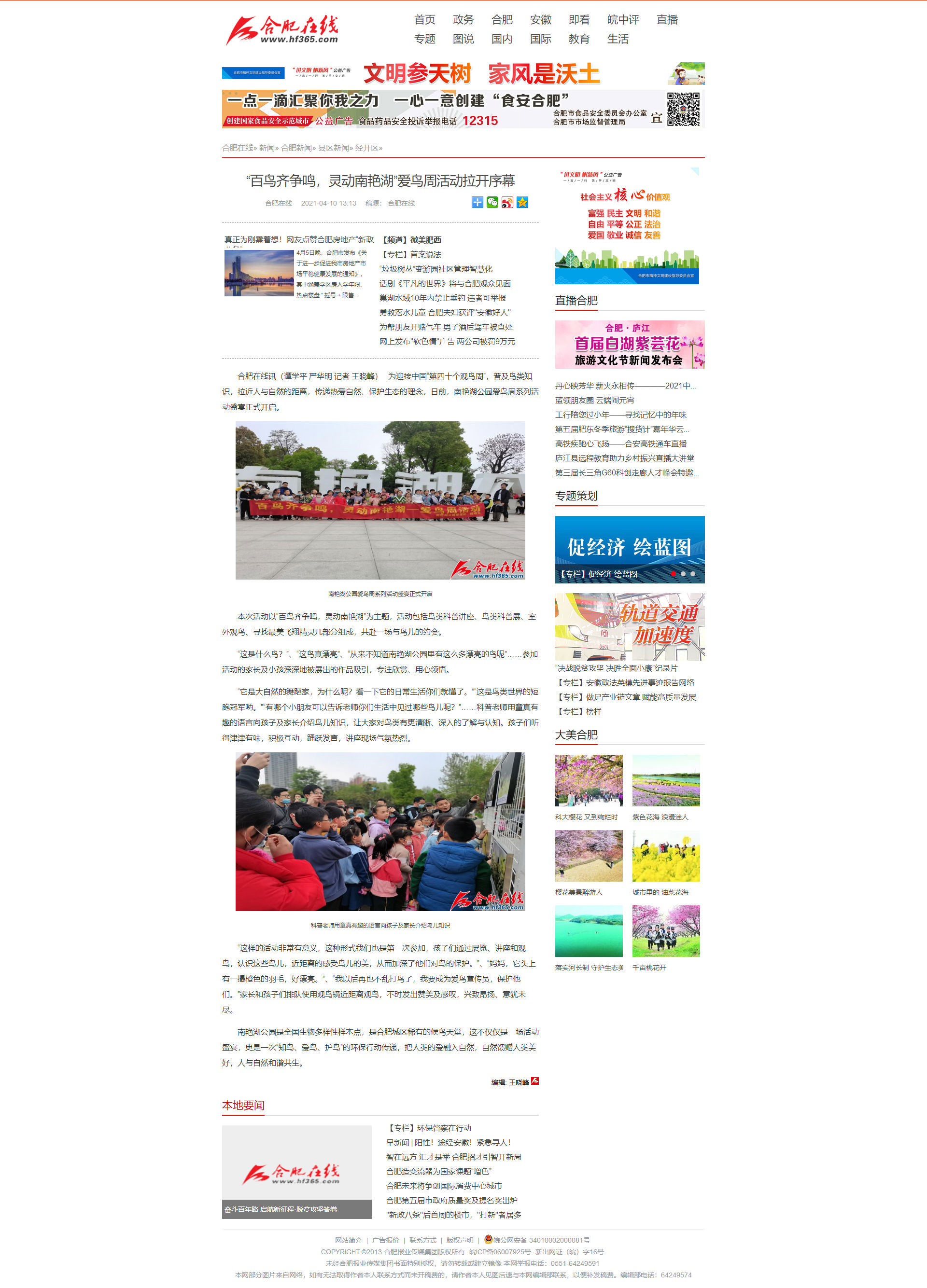 合肥在线:“百鸟齐争鸣,灵动南艳湖”爱鸟周活动拉开序幕 http://www.hf365.com/2021/0410/1346082.shtml