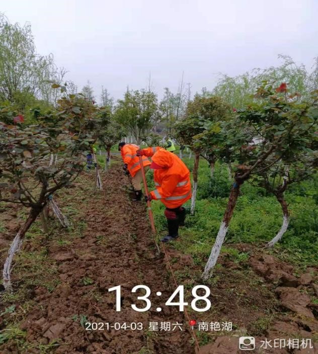 “整容”五步法,旧貌换新颜。步法一开盘施肥剪残花棵棵植株开盘并环施有机肥,剪掉残花,让月季冬季储备足够的肥料,利于来年抽芽开花;步法二冬剪疏枝整形,在冬季初期,邀请专家来现场指导植株修剪,主要去除衰弱枝、病虫枝、并短截徒长枝,以整形为主,保持植株好形态;步法三病虫防治勤观察,当发现部分植株出现少量黑斑病,立即开展病虫害防治,同时对蚜虫高发期,提前防范干预;步法四除草翻土理排沟 春季杂草疯涨,分三组人员分别除草、翻土、理排沟,可以减少养分流失,改善土壤疏松透气,避免积涝;步法五植株移植补缺 月季喜阳,一部分植株近林荫,长势开花受影响,一部分区域植株分布不均,有碍观赏性,本次进行了统一移植,保持园内植株棵棵上镜抢眼;接下来还将追施薄肥,促叶促花。