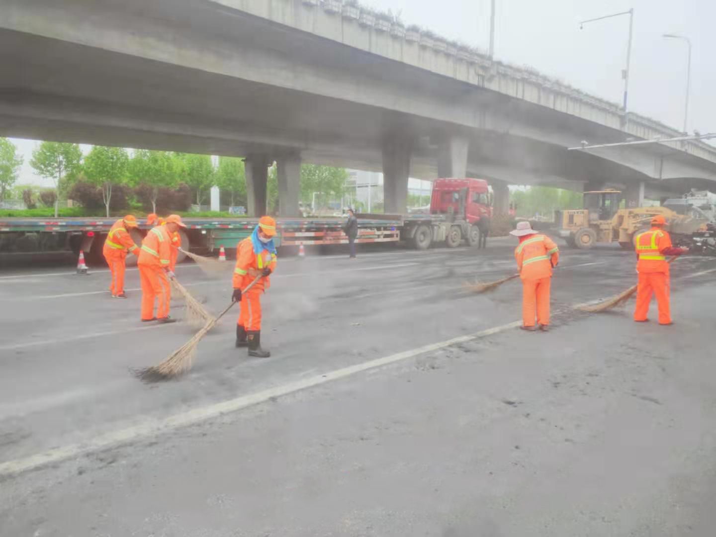 经过争分夺秒的细致清理,现场成片的黑灰逐渐缩小、成堆的燃烧物逐渐减少,露出浴火后满是斑驳、油污的路面。洒水车、养护车、保洁员立即迎上,无缝衔接。水车冲洗过后,保洁员再抱管精细冲洗路面残留油污,直至路面重现见本色。