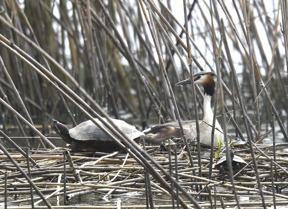 这对惹人怜爱的风头鸊鷉“夫妇”,在南艳湖里相守相伴近2个年头,他们一起嬉戏,一起共舞,一起捕食,生活恬静舒适,但生活不如意十之八,前置库水位时常变化,他们不能营巢而饱受露宿之苦,特别在繁殖季节,爱巢时常被巴西龟占据,导致一次次弃巢,最终选择同巴西龟抗衡,在被巴西龟霸占的巢里产卵、孵化。