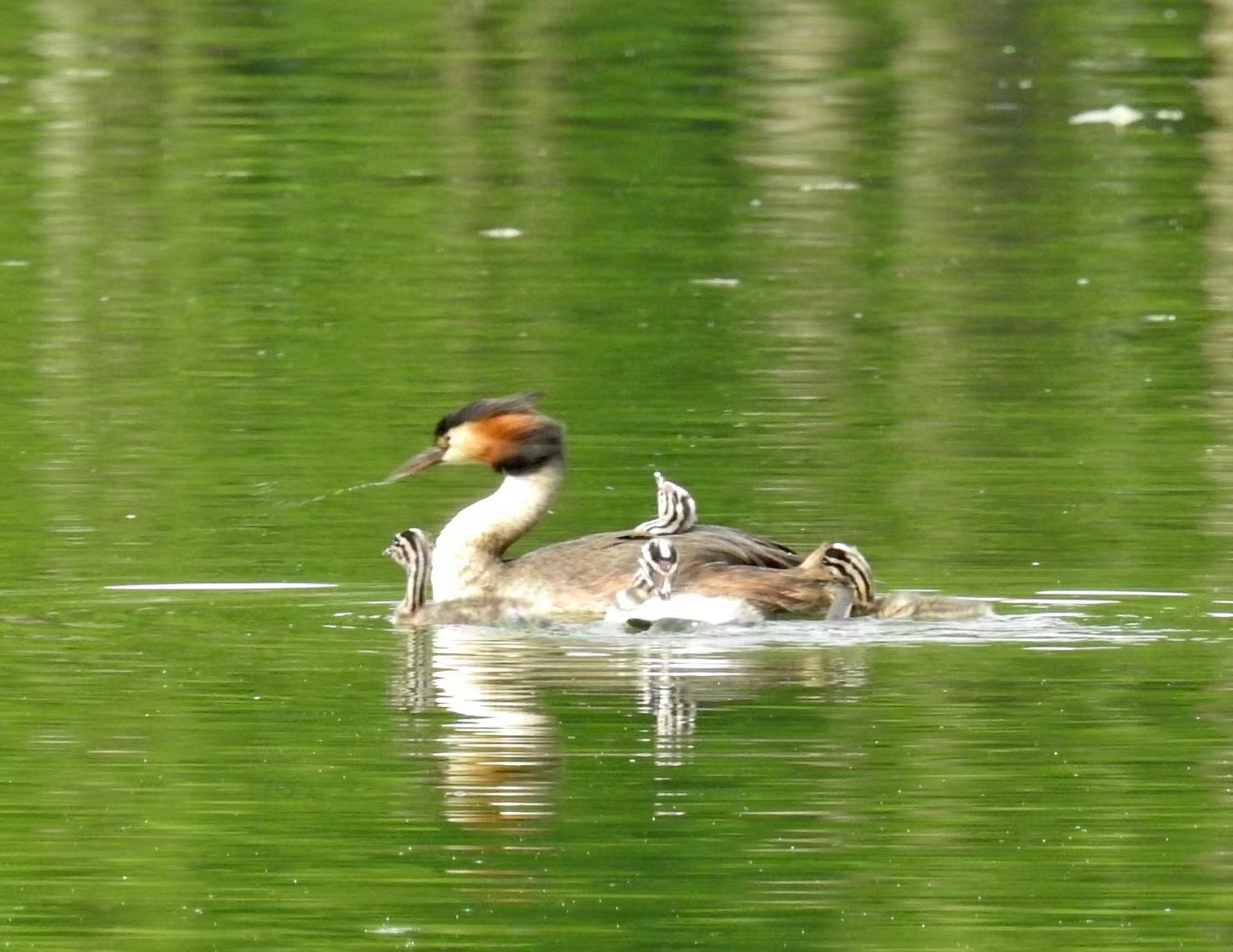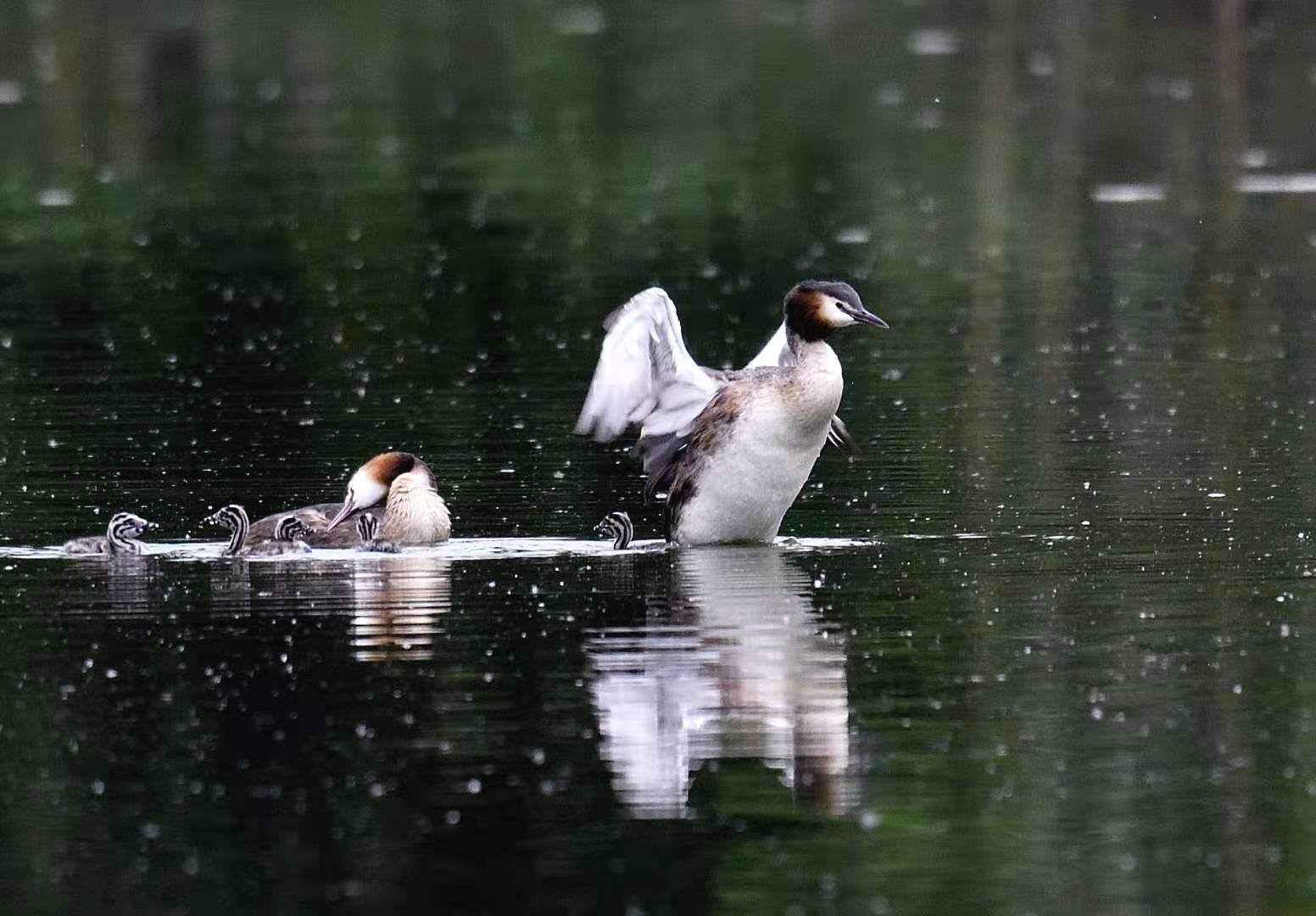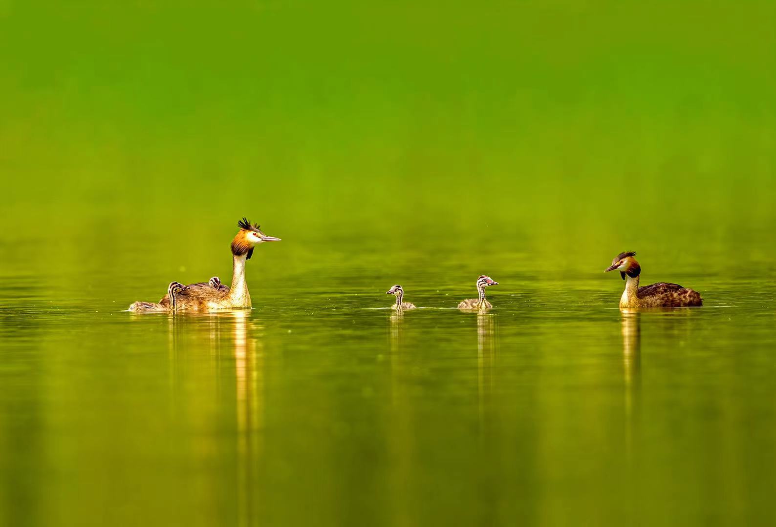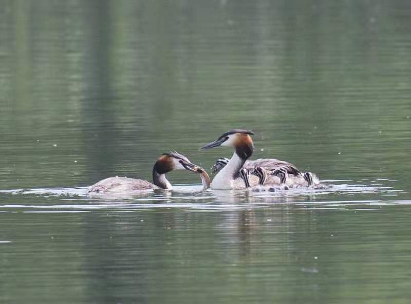 ??爸爸是“饭碗”,肩负着家的责任,每天早出晚归为宝贝们捉鱼喂食,??妈妈是诺大的航母,稳稳当当地护佑着五只小宝在湖面上游荡,期待着爸爸满载而归,宝宝们在爸爸妈妈的精心养育下一天天长大,他们开始调皮了,可以互相掐架,有时爬上妈妈背,像是玩滑滑梯,其乐融融。
