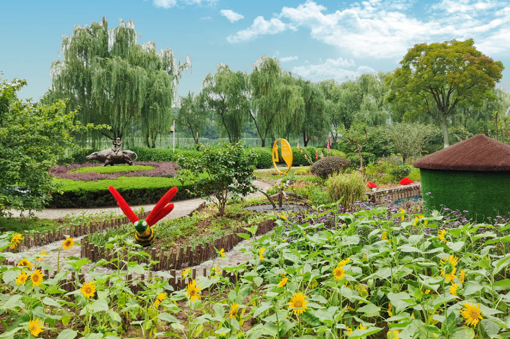 位于翡翠湖风景区“凌碧桥”南侧,一处近千平方米的微景观近日亮相,整个设计由三个板块构成,分别为“牧童唱晚”雕塑区,展现阳光向上、幸福欢乐的和谐氛围;田园风貌区,通过旧式农具如粮仓、水车、犁耙等,传承一种农耕文化,忆苦思甜;挂满硕硕累果的“五谷丰登”艺术树,传递着丰收的喜乐;蜿蜒的杉木桩漫步道嵌入花丛中,漫步其上,“陌上花开,可缓缓归矣”的深情油然而生;自然野趣区,以蓝色覆盖物塑造的“涓涓细流”同花篮倾泻而出的带状小花海交相辉映,融为一体,寓意着幸福生活,细水长流。