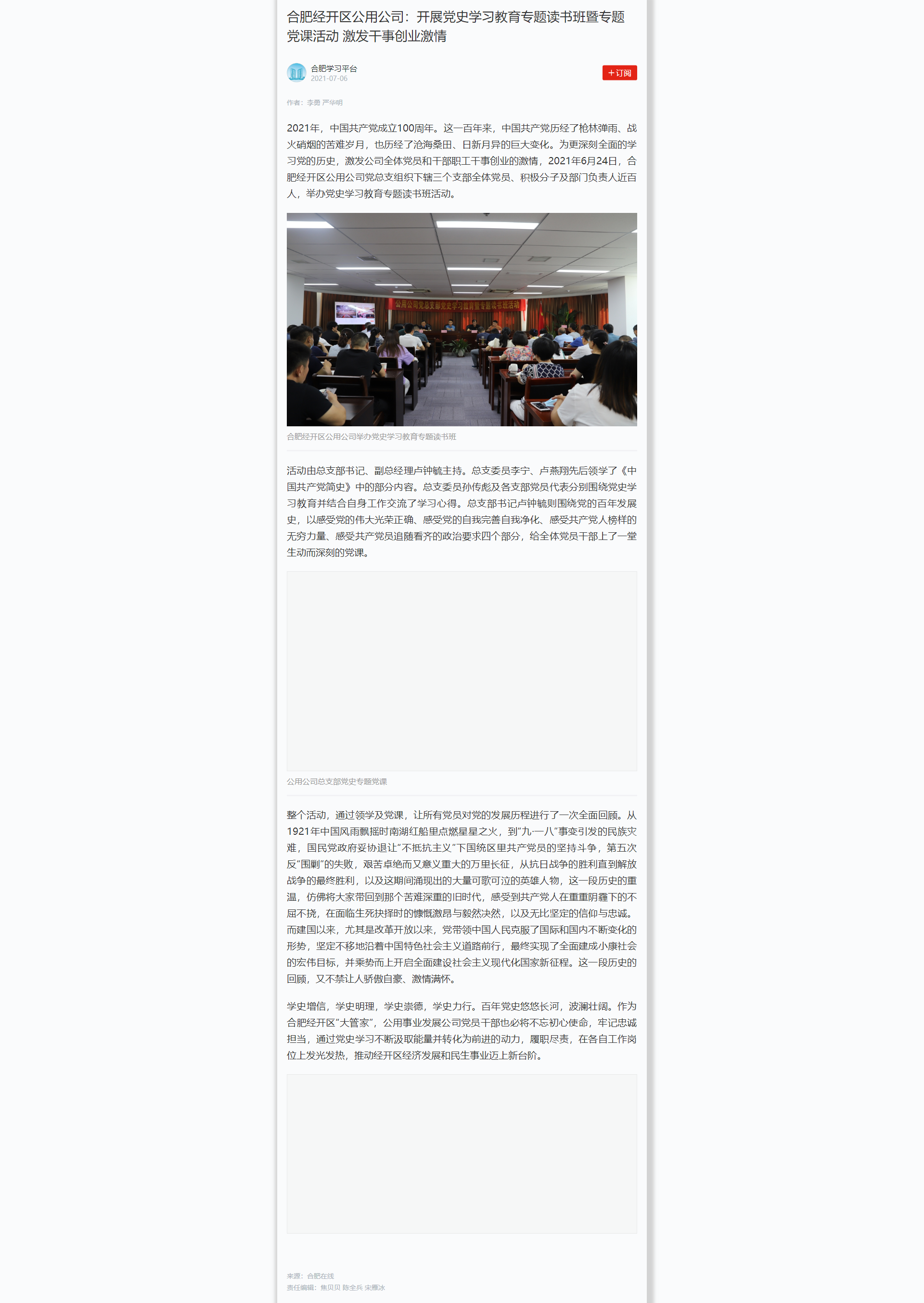 学习强国:合肥经开区公用公司:开展党史学习教育专题读书班暨专题党课活动 激发干事创业激情