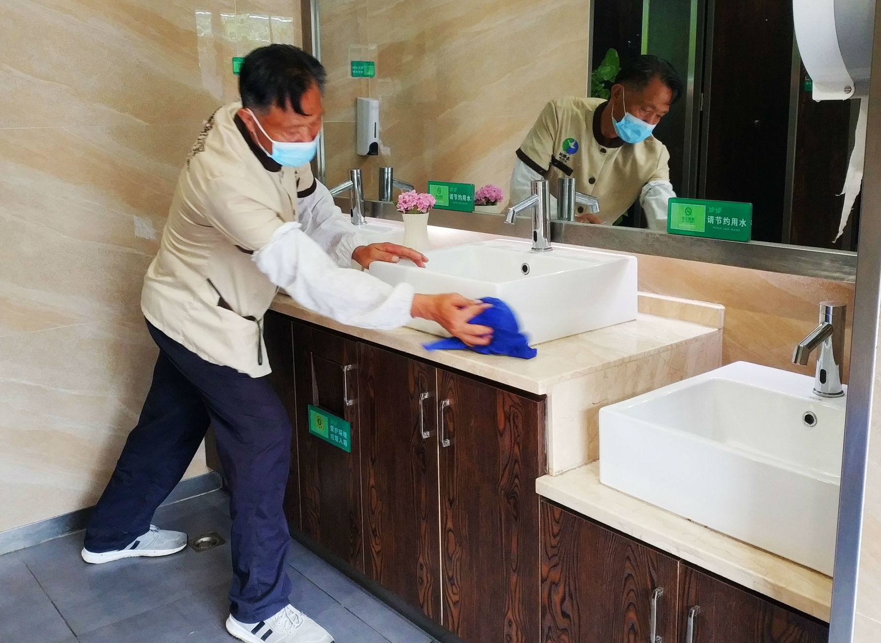 擦拭完绿萝叶子,时间已经到了11:20。谈到自己的工作,老范如数家珍,张嘴就来:“墙壁、隔板、门窗、灯具,每日都要搽拭;洗手台面和镜面随时保持干爽无水迹和灰尘;地面及时清扫冲洗,保持洁净无污物、无蚊蝇、无蜘蛛网;便池、蹲位要及时冲刷。”说完,老范又补充一句“一定要随时保持洁净无水锈、无异物、及时倒空纸篓,不得溢满”。
