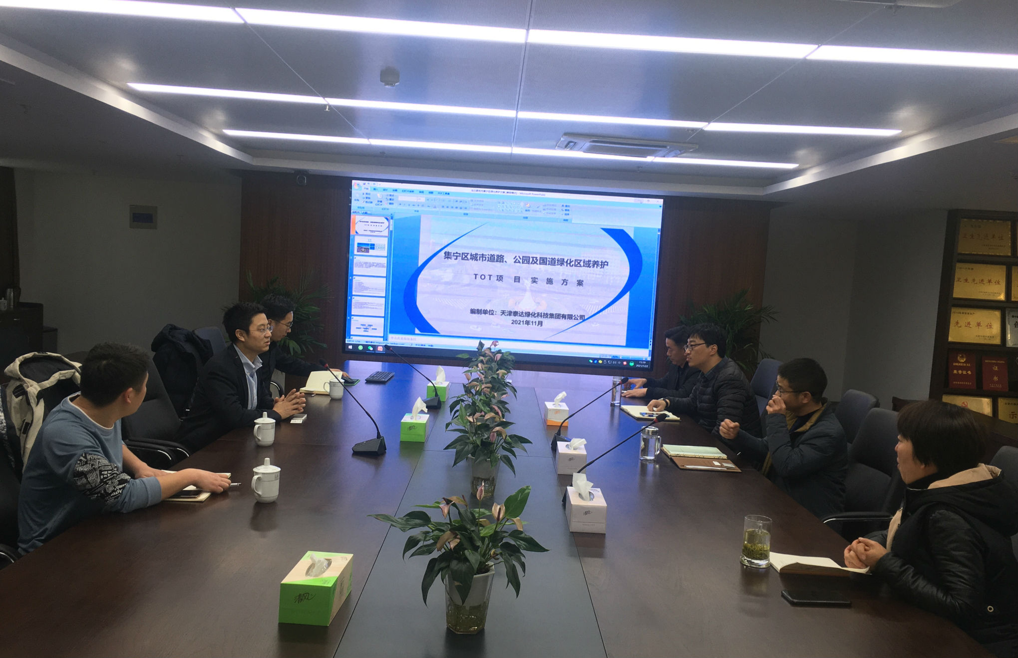 交流会上,天津泰达公司常务副总经理曾威介绍了天津泰达在绿化养护等方面开展的先进TOT项目经营方式、相关特色和亮点,以及结合园林现有苗圃业务拓展的林下经济及碳排放交易。随后,卢钟毓对公用公司现有组织架构、业务板块以及园林公司相关情况进行了介绍,双方就现有业务进行深入探讨与交流。