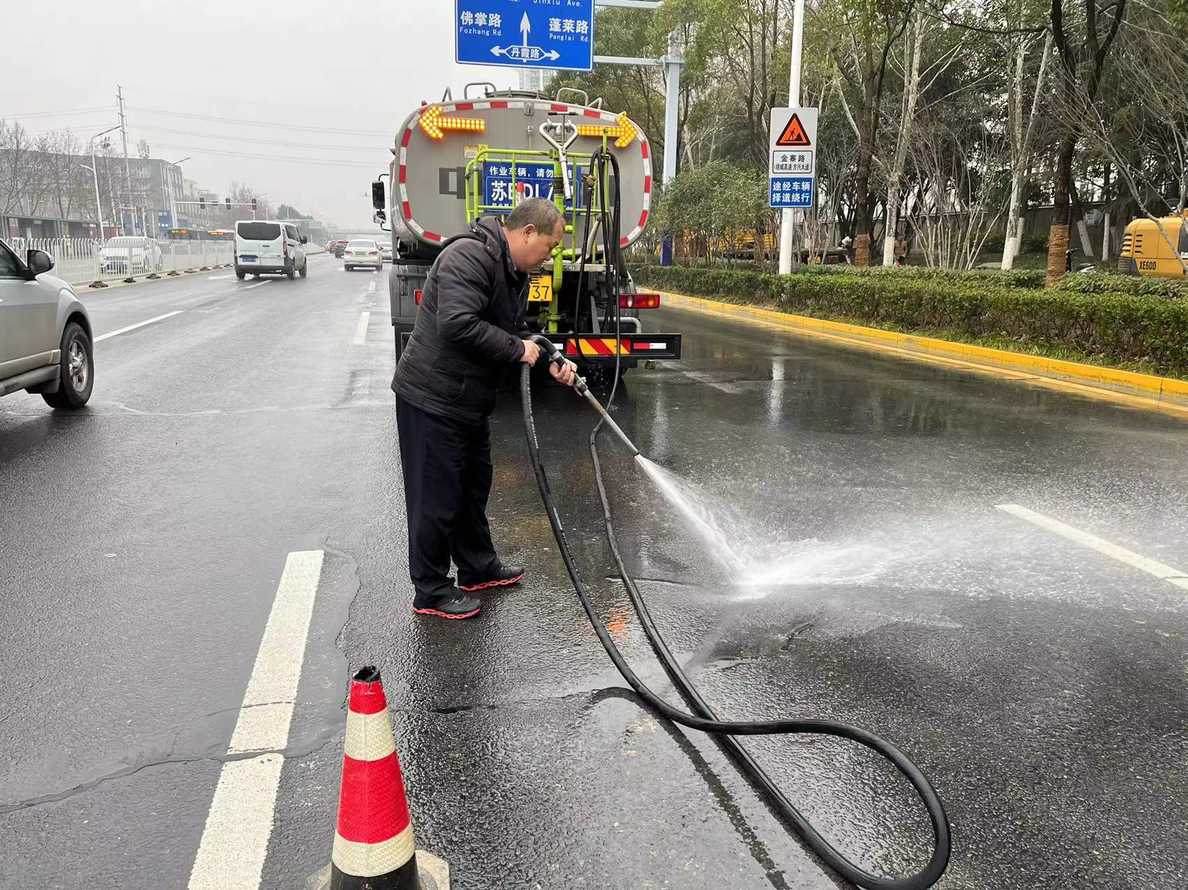 中心在巡查途中发现积水后快速响应,调集10余名环卫工人和2辆水车现场待命,在供水公司抢修完成后设置警示牌和反光锥,引导车辆和行人安全通行,并对现场残留积水及时清扫,恢复路面整洁,保障通行顺畅。为避免管道二次堵塞,环卫工人对自来水冲出的砖石泥土进行人工铲除并及时清运。本次应急清理投入人员30人,水车2台,洗扫车、货车、皮卡车各1台。经过一上午紧张的清理,莲花路现场积水和淤泥杂物已全部清理干净,道路恢复了往日的干净整洁。