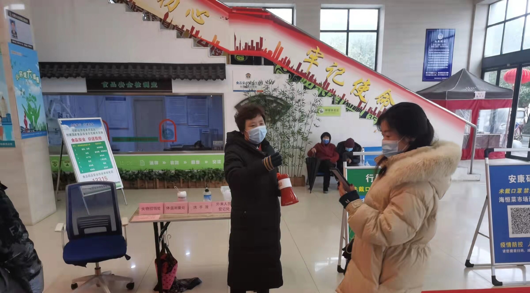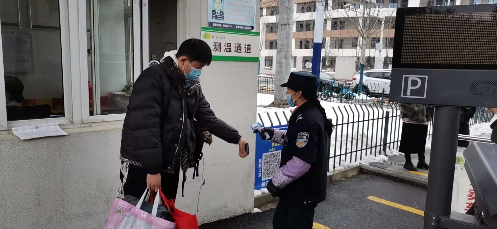 “您好,请出示一下您的行程码及安康码,另外麻烦您在这里做好登记”。春节前,物业小区陆续新配置了42台立式测温仪。春节期间,各个物业小区门口都能看到工作人员坚守“战疫一线”的忙碌画面,工作人员严格落实合肥市疫情防控最新要求,强化人员排查,做好测温工作,细致核查登记每一位返乡人员信息,并查验核酸检测阴性证明。