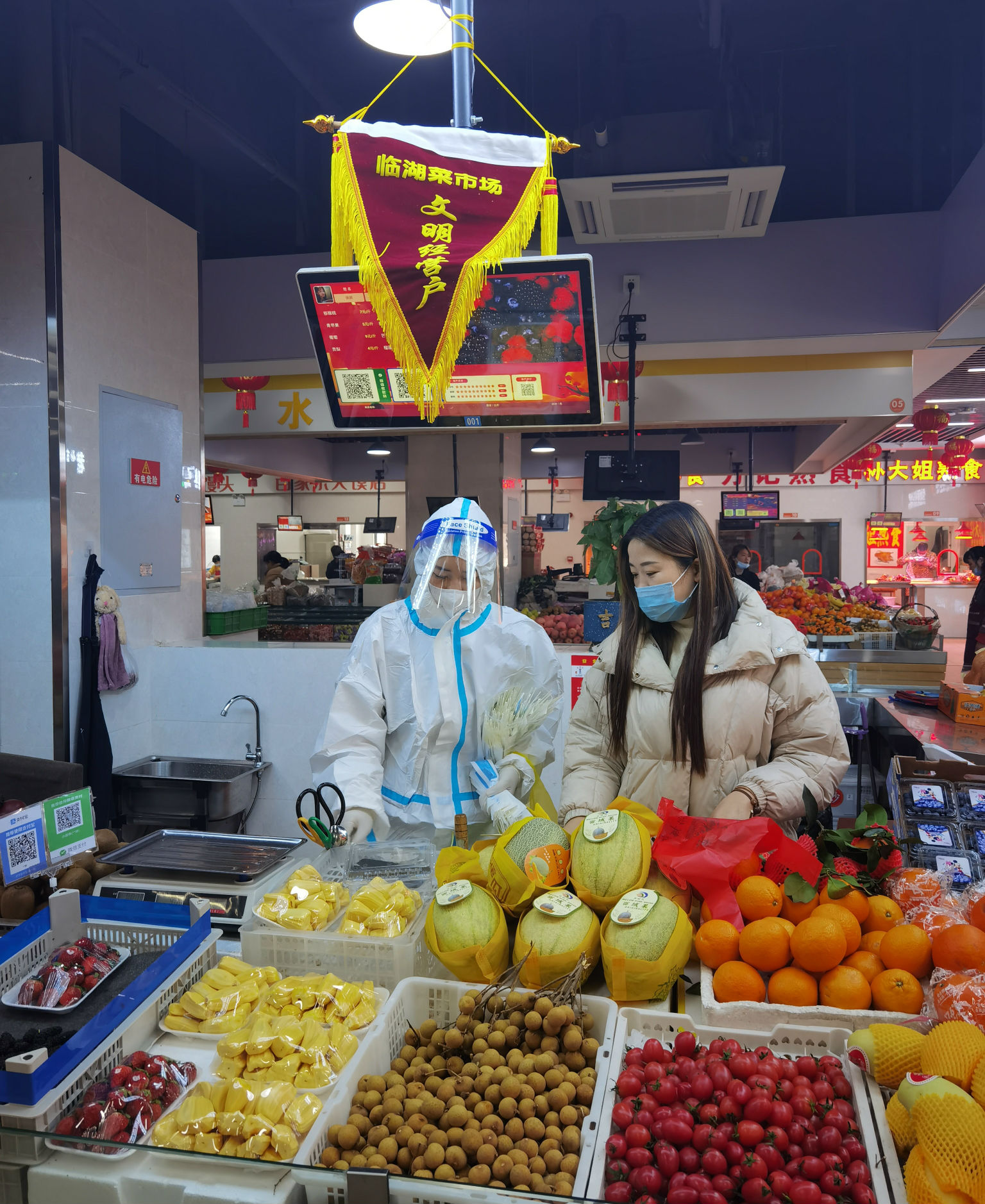 一是再强化经营户、工作人员健康管理。加强人员管理,实行菜市场防疫工作每天上报工作制,对经营户、工作人员逐一摸排、体温检测、二码再查验。一旦出现异常情况立即停止营业并上报,对相关区域进行全面消毒。二是制定疫情防控督查考核和应急处置机制。加强与运营管理单位的沟通交流,对疫情防控提出明确要求。自2022年2月起,公司及部门疫情防控专项督查小组每日严格开展多层次督查,对薄弱环节进行通报并立即整改。对疫情防控明确处置流程,畅通信息报送渠道,提升疫情防控处置能力。三是强化场所防疫管控。增加人员力量,严管出入口,落实测温、扫码、规范戴口罩“三件套”,对来自中高风险地区人员禁止进入市场并上报;场内专职人员巡场,对不规范佩戴口罩人员及时提醒和整改;严格按照标准每日进行清洁、消杀,确保空气流通、环境卫生。四是加强食品安全索票索证管理。严防食品管理,加大进口冷链食品、进口水果等自查登记及索证索票力度,保证进口冷链食品“五证一码”、进口水果需“四证”齐全。五是组织对市场人员及环境样本进行核酸筛查,做到定期全覆盖。每日对应辖区防疫部门组织经营户进行核酸和环境样本检测,确保做到“应检尽检,不漏一人”;同时对疫苗加强针接种到期的经营户督促、协调接种疫苗。六是加强信息收集与宣传。循环播放疫情防控语音提示,张贴并宣传最新防疫公告及讯息,引导人员做好个人防护,支持配合防控措施落实。
