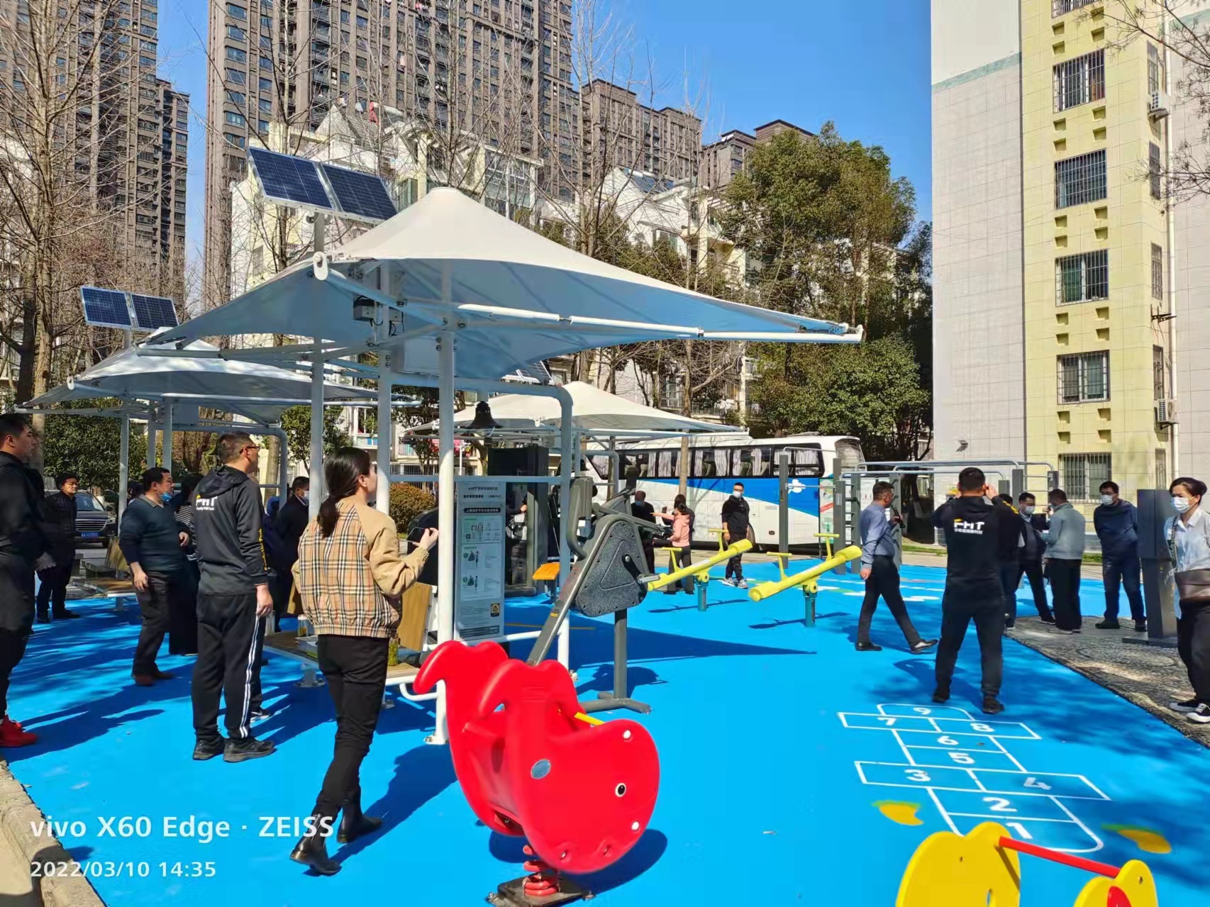 新建的小区智慧健身驿站由智能体侧亭、智能双功能健身器材、组合训练器、儿童跷跷板、摇摇乐等硬件设施及好家庭室外智能软件系统共同组成。居民在使用健身器材锻炼身体的同时,能通过智能设施了解自身身高、体重、心率等健康数据,量身制定健身计划。