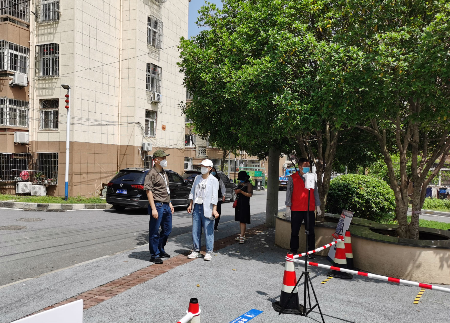 汪庭歌每到一处,都与物业工作人员和志愿者亲切交谈,详细询问核酸检测准备情况,仔细叮嘱他们一定维护好检测现场秩序特别是确保待检测人员整齐排队,保持安全距离,做好现场消杀工作,在做防疫工作的同时,做好自身防护。在看到民悦花园、恒创公寓、福禄园A区一、二期检测点现场布置规范、队伍整齐、检测有序、消杀到位的情况后,汪庭歌十分满意,他表示,物业工作最辛苦,但物业队伍是一支能战斗的队伍。在福禄园A区三期检测点,汪庭歌详细询问了项目负责人孙莉近日有没有回家,在项目上工作和生活情况。4月中旬,孙莉所住小区被列为封控区,她本可以选择回家接受封控管理,照顾孩子,但为了不耽误项目防疫工作的正常开展,毅然放弃了下班回家,而是将两个孩子交由丈夫照顾,自己选择留在管理处防疫一线,与同事们并肩作战。在枣庙园检测点,在看到物业工作人员张腊梅同志身穿防护服,忍着闷热长时间坚持采集检测信息时,汪庭歌连连表示:辛苦了,物业人。在康利B区、民悦花园、近湖苑、枣庙园等检测点,都竖起鲜红的党旗,党员志愿者们佩戴党徽配合防疫工作,汪庭歌与党员志愿者们亲切交谈,他表示,在抗击疫情的关键时期,党员同志特别是老年党员能主动站出来,走到抗疫战斗一线,充分发挥了一个党组织一个战斗堡垒,一个党员一面旗帜的作用。在了解到管理处负责人都五、六点钟便到现场,做好现场检测简易棚搭建、桌椅摆放、四周防护、地下一米线等布置准备工作时,汪庭歌对大家表示慰问。