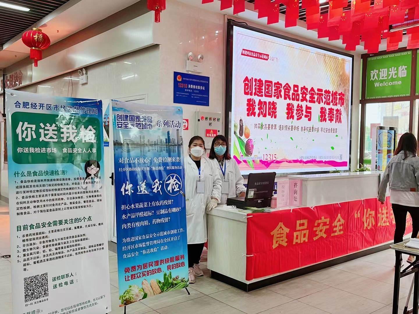 辖区市场规范张贴创建国家食品安全示范城市、禁食野生动物、长江禁渔等宣传海报,其中示范菜市场LED显示屏滚动播放创城标语和视频,过渡区菜市场悬挂创城标语横幅,通过自媒体平台、广播及带动商户等,努力扩大关注度。此外,增强食品经营者自觉履行主体责任意识,签署《食品安全承诺书》,向商户及消费者分发《致广大市民的一份信》,提升公众知晓率,促进全民食品安全意识提升,积极参与食品安全创城共治。