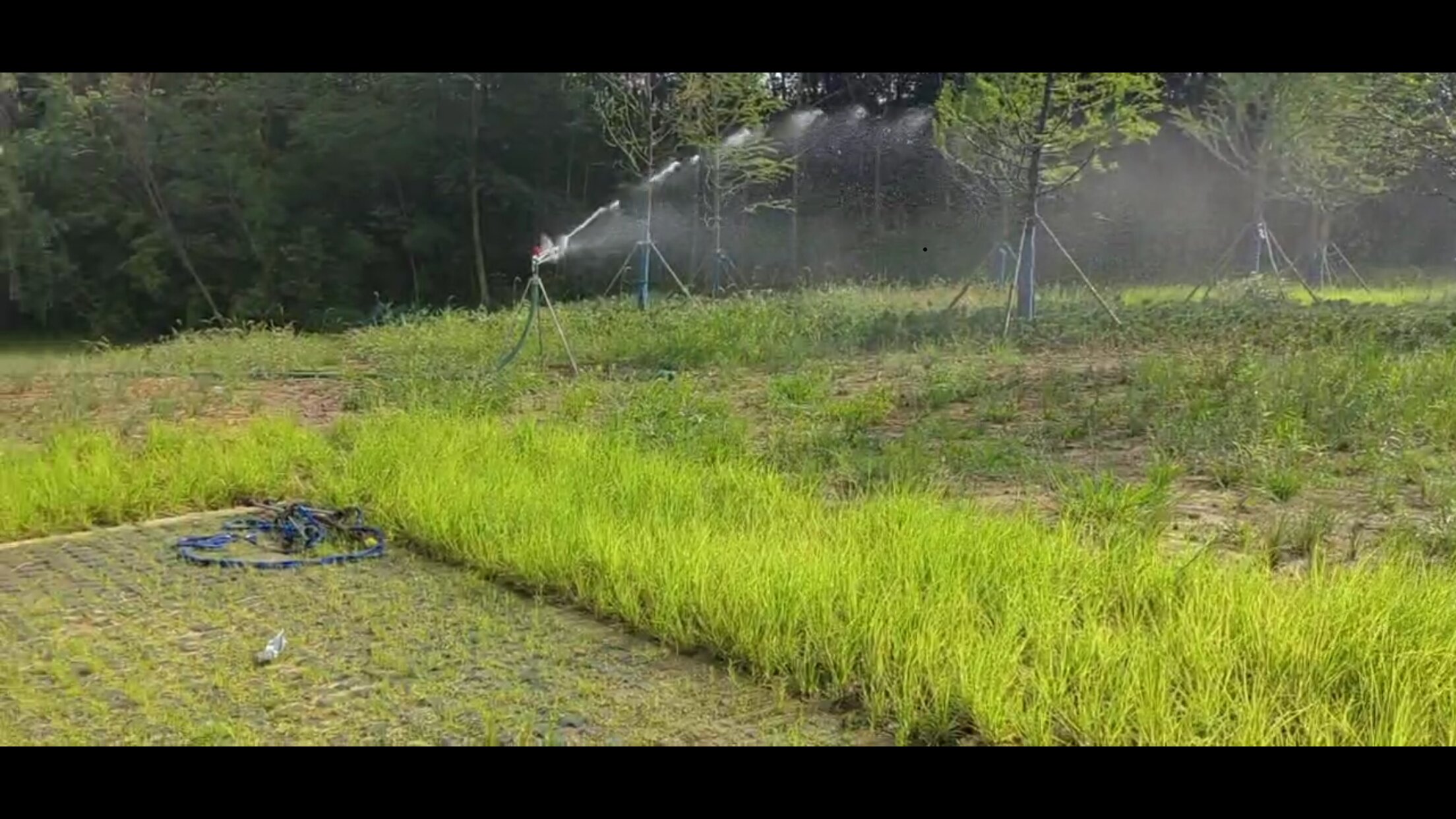 连续的高温晴热天气给抗旱保苗工作带来了严峻的考验。香怡市政园林创新在王建沟项目试验安装“自动旋转喷头”泵车系统,该系统利用三角架将水管固定,在水管上安装自动旋转喷头,通过水泵压力及自动旋转喷头实现360度旋转喷射,射程可达20-30米,不仅能高效快速的对射程范围内的苗木进行浇水灌溉,有效完成浇灌任务降低绿化工人高温灌溉的作业风险,同时该系统可移动喷洒,哪里需要洒水就可将设备移动到哪里。