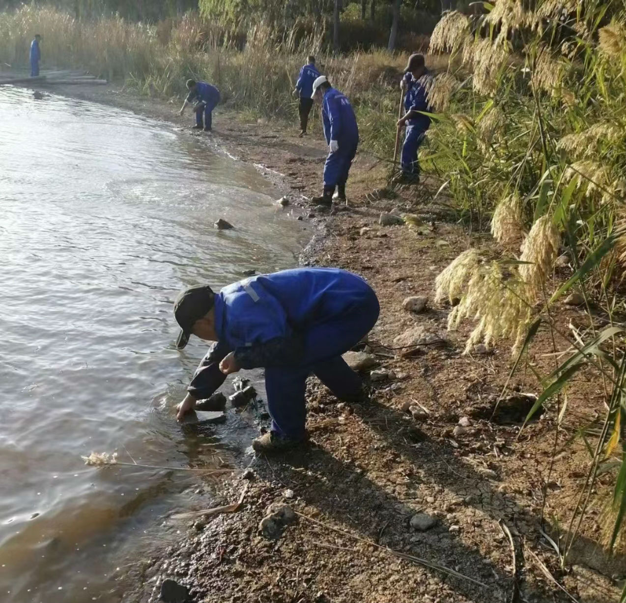 近日,南艳湖水岸线定时出现一队着蓝色服装的人群,他们带着锹、桶、袋等工具在岸线不停挖、撬、提、挑着,原来他们是南艳湖的应急“突击队”,集中对裸露浅滩开展“大扫除”。