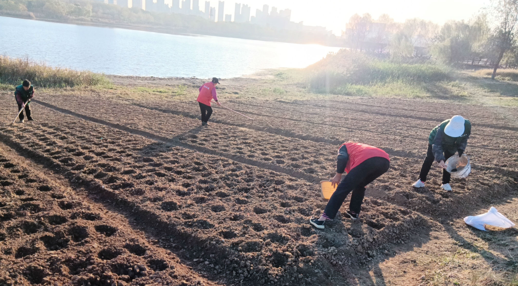 油菜种植区选在公园西门阳光大草坪湖岸边,约五亩地,工人旋耕土地、清除草根、施用底肥、开畦筑垄、点播种子、一气呵成,两天时间近万株油菜播种完成,一排排、一畦畦甚为壮观,一个星期的悉心养护,小嫩芽悄然出头。