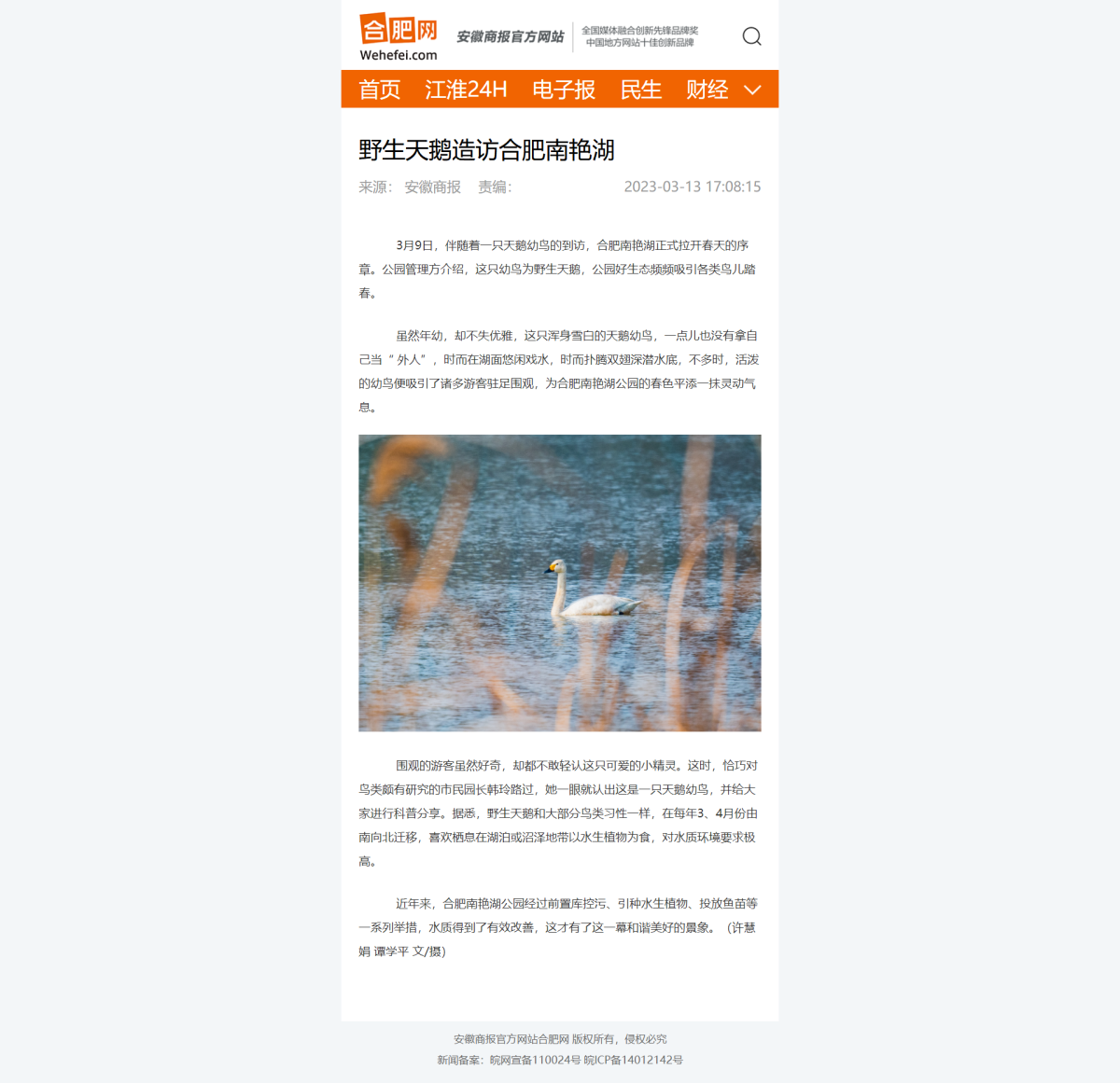 上一条:安徽日报:野生天鹅造访合肥南艳湖
