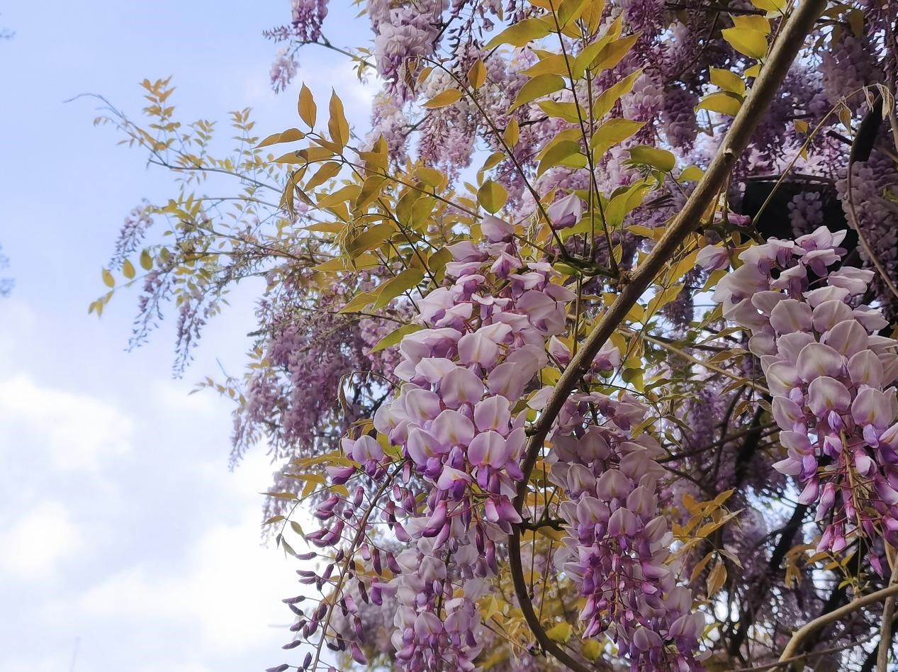 目之所及,紫藤花穗像一串串熟透了葡萄,又像一片片祥云,开的空幽而烂漫。地上落了薄薄的一层花瓣,像刚下过一场紫花雨。当一阵春风吹过,蓦然觉得,纵使姹紫嫣红开遍,也不及上眼前这满是紫藤的春色。
