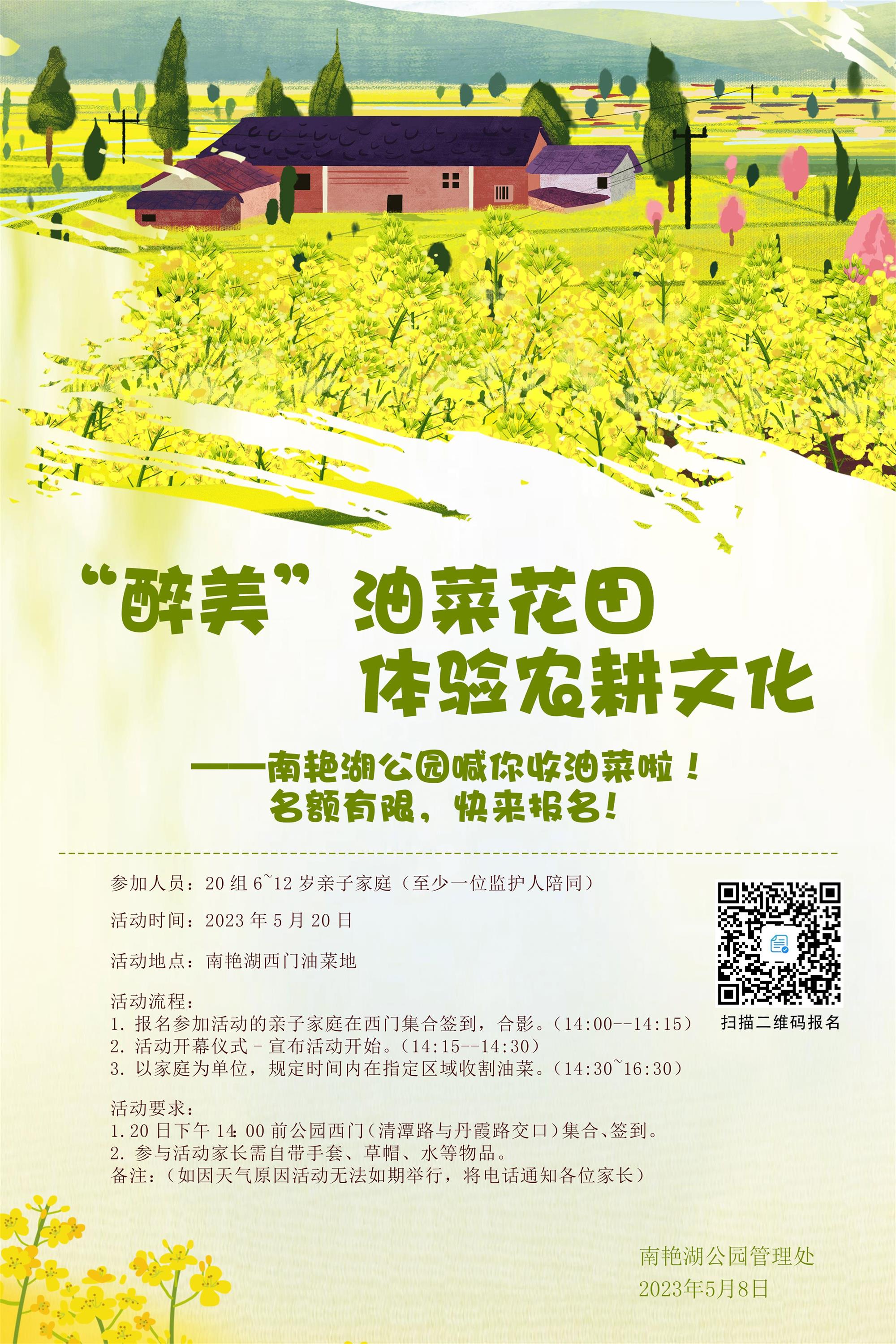 三月赏花,五月收籽。立夏之后,南艳湖公园油菜花田里的油菜荚已由淡青转为嫩黄,鼓起圆溜溜的肚子,这时,正是油菜籽收割的好时节,为给周边市民提供一个深度体验农耕文化的契机,近日南艳湖公园将策划一场油菜收割活动。现将活动项目和要求安排如下: