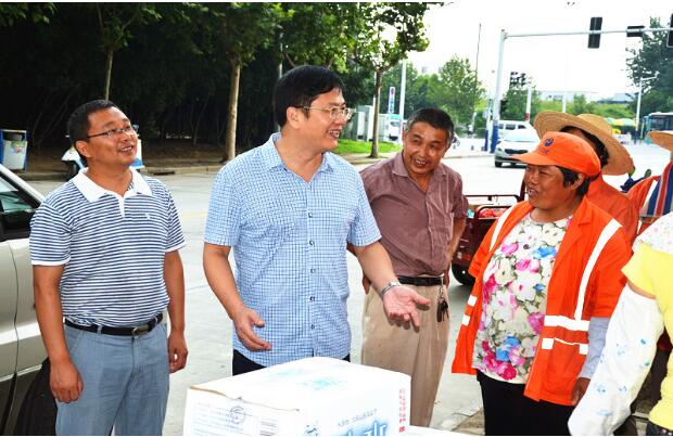 8月1日上午,海恒集团常务副总经理王礼祥一行来到作业现场,慰问高温天气下坚持工作的我司环卫及物业一线工作人员。公司副总经理刘文来、工会主席卢燕翔陪同慰问。(综合)