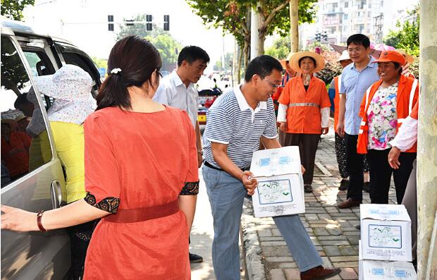 公司副总经理刘文来亲自为环卫工人搬卸降温饮品