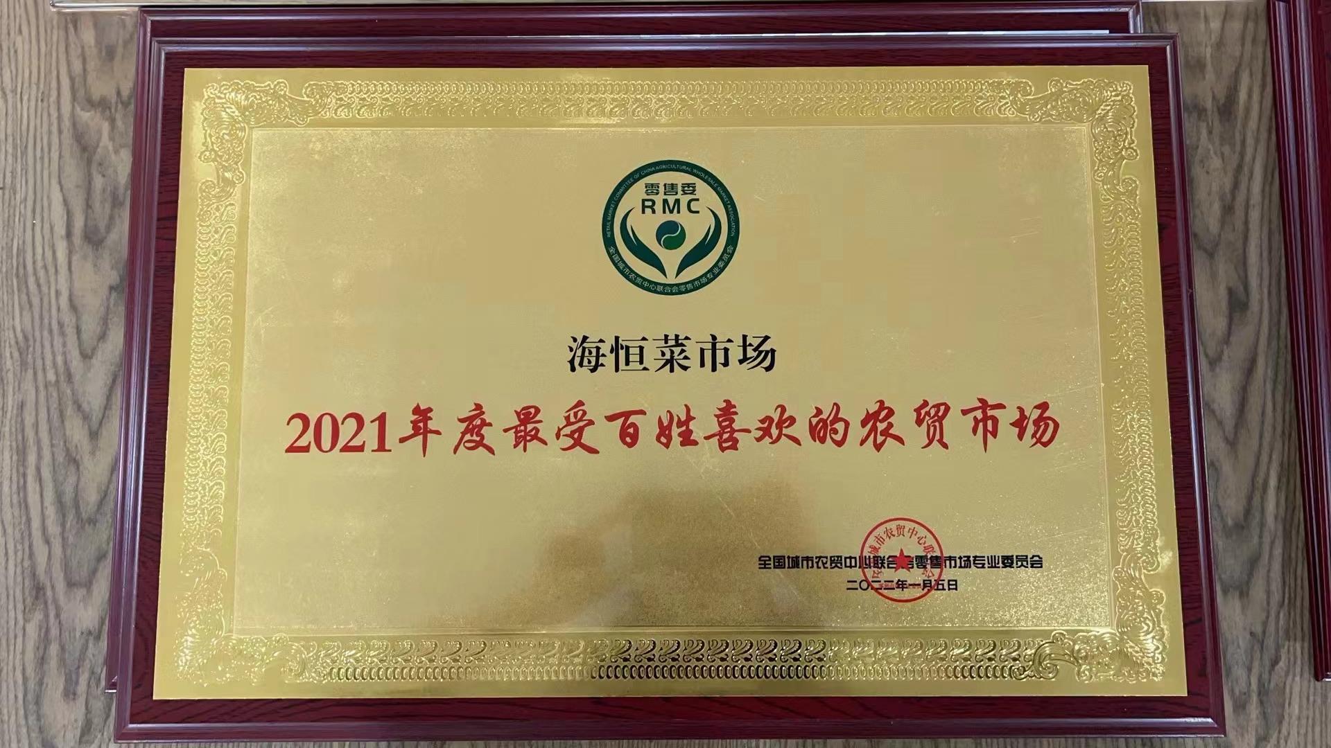 近日由全国城市农贸中心联合会主办,在杭州2023年全国农贸市场行业年会上,近300位农贸市场和企业代表共议农贸市场发展趋势,共话农贸行业创新发展之路,评选表彰先进单位和个人。因疫情原因延迟颁发2021年度农贸市场先进单位和最新评选出炉的2022-2023年度农贸行业先进单位,海恒菜市场在此大会上荣幸被评为“2021年度全国最受百姓喜欢的农贸市场”和“全国2022-2023年度标准化示范菜市场”两项称号,并参加授牌仪式。