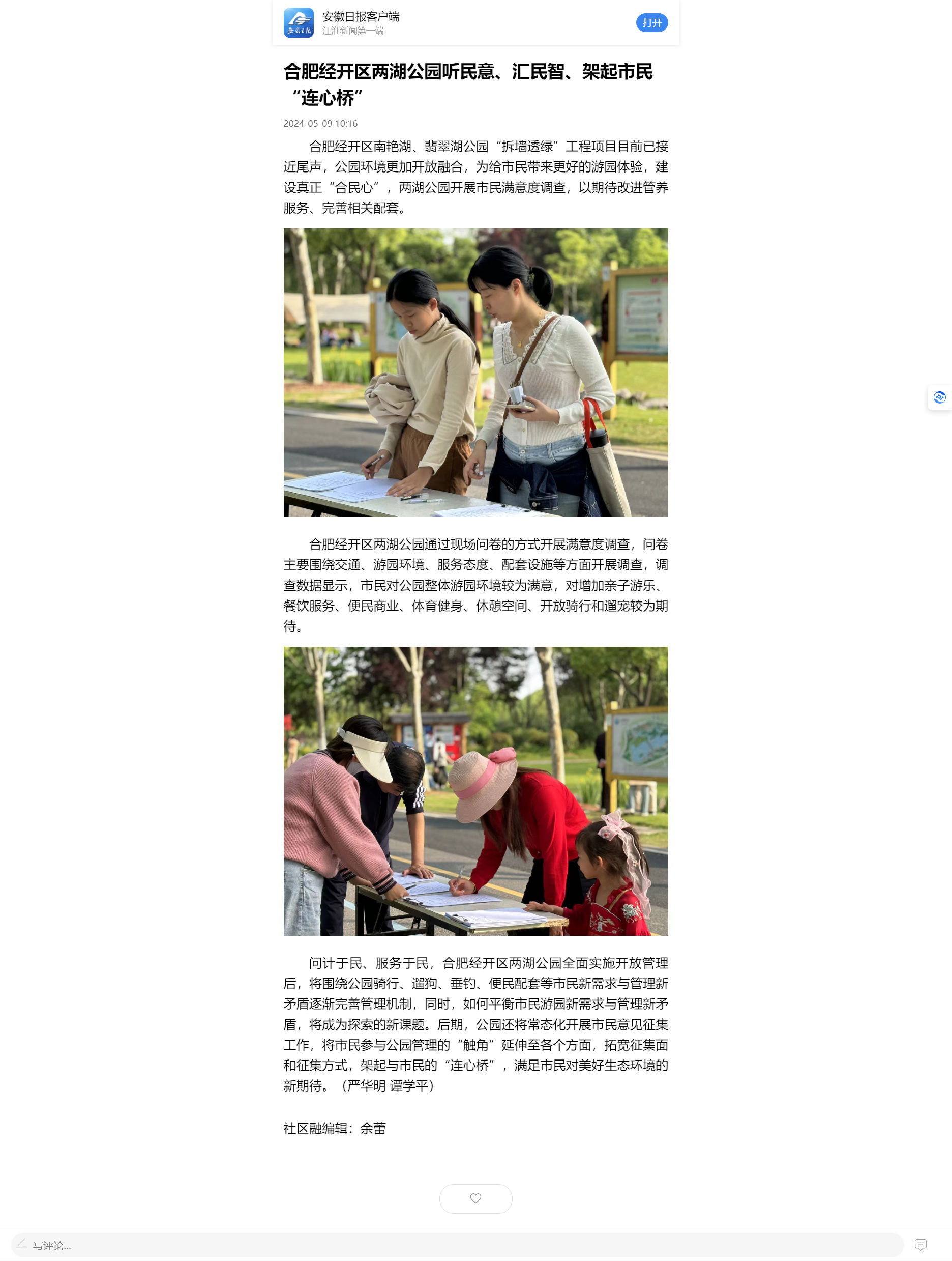安徽日报:合肥经开区两湖公园听民意、汇民智、架起市民“连心桥”