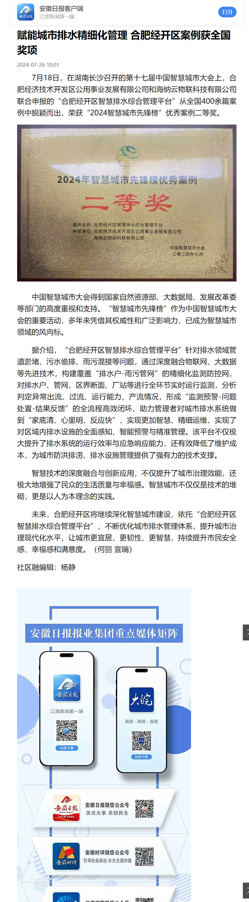 安徽日报:赋能城市排水精细化管理 合肥经开区案例获全国奖项