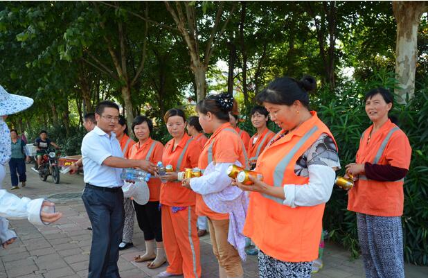 8月4日下午,公司副总经理卢钟毓与海恒集团相关人员一起,来到锦绣社区,慰问高温下坚持作业的环卫工人,并送上饮品等防暑降温物品。