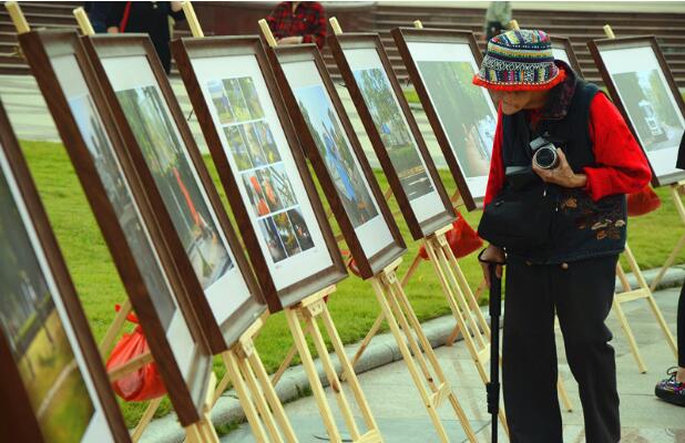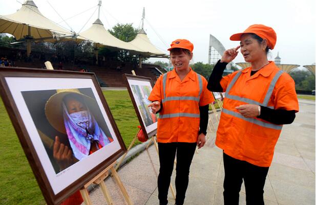 环卫工人饶有兴趣的欣赏摄影大赛的优秀作品