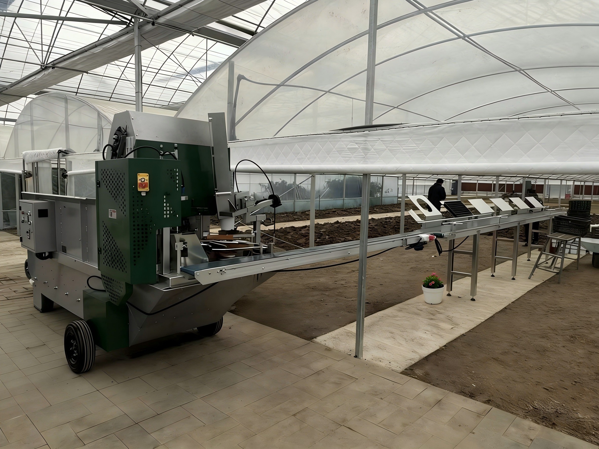 这台自动装盆机采用人工装填泥炭土、机械自动装盆的作业模式,可精准完成花盆定位、土壤填充、压实等一系列工序。相较于传统人工装盆,不仅大幅降低了人力成本,更将单盆作业时间压缩至数秒,有效避免了土壤填充不均等问题,显著提升了花卉苗培育的标准化与精细化水平。