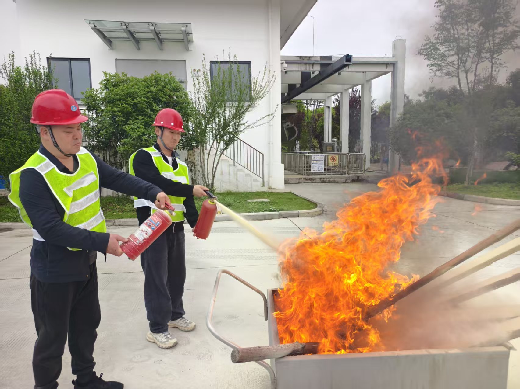 在蓬莱路泵站应急处置演练中,同步开展两项关键科目。模拟泵站主用高压线路停电,操作人员快速完成备用线路切换,顺利启动水泵恢复排水;模拟泵站起火险情,参训人员规范使用灭火器,站在上风方向对准火焰根部精准喷射,快速扑灭“火情”,其余人员有序疏散,全程安全规范、动作熟练。