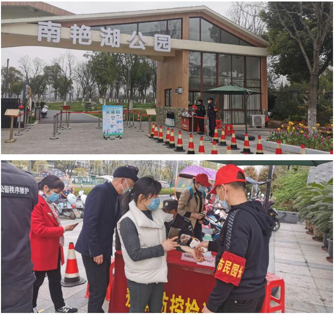 为保障南艳湖公园确保防疫工作落到实处。开园前,南艳湖公园管理处提前一周谋划、筹备开园预案。开园后,南艳湖管理处采取了一系列“严防疫+人性化”举措,引导游客安全有序游园。为保障人员管控到位,南艳湖公园仅开放东大门、西大门,入口改为标准型一进一出。此外,南艳湖公园入口处还设置了体温预检处,人员出示安康码、正确佩戴口罩之后方可入园。此外,各入口处还配备消毒液、口罩、手套、防目镜、测温枪等防疫物资,出入口处还设置了废弃口罩丢弃处和临时隔离点,严格落实各项疫情防控措施,保障安全游玩。