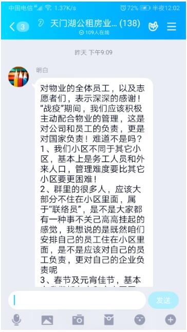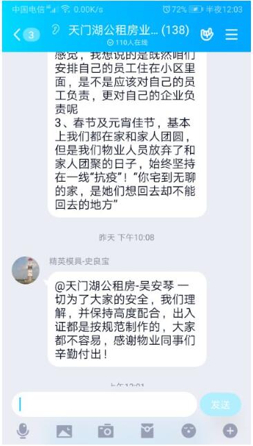 2月25日,天门湖公租房物业项目负责人薛东萍正在查看新入住员工信息,一旁的手机不停地响,她随手点开后激动不已,企业群里满是对物业疫情防控工作的理解和肯定,企业主动呼吁共同配合物业管理,履行企业之职。