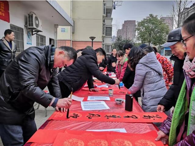 活动现场,人头攒动,热闹非凡,到处是喜气洋洋的欢声笑语。工作人员在物业办公室门前空地上放置书桌,铺上红艳艳的毛毯,摆好笔墨纸砚。笔墨丹青,翰墨飘香,书法家挥毫泼墨,如行云流水一般书写着各类喜庆的春联、福语。各位书法家现场书写赠送了"福"字和春联近200幅。春联满怀着人们对新年美好生活的向往,居民获赠春联后无一不面露喜悦的笑容,纷纷赞美书法家们高深的书法功底。