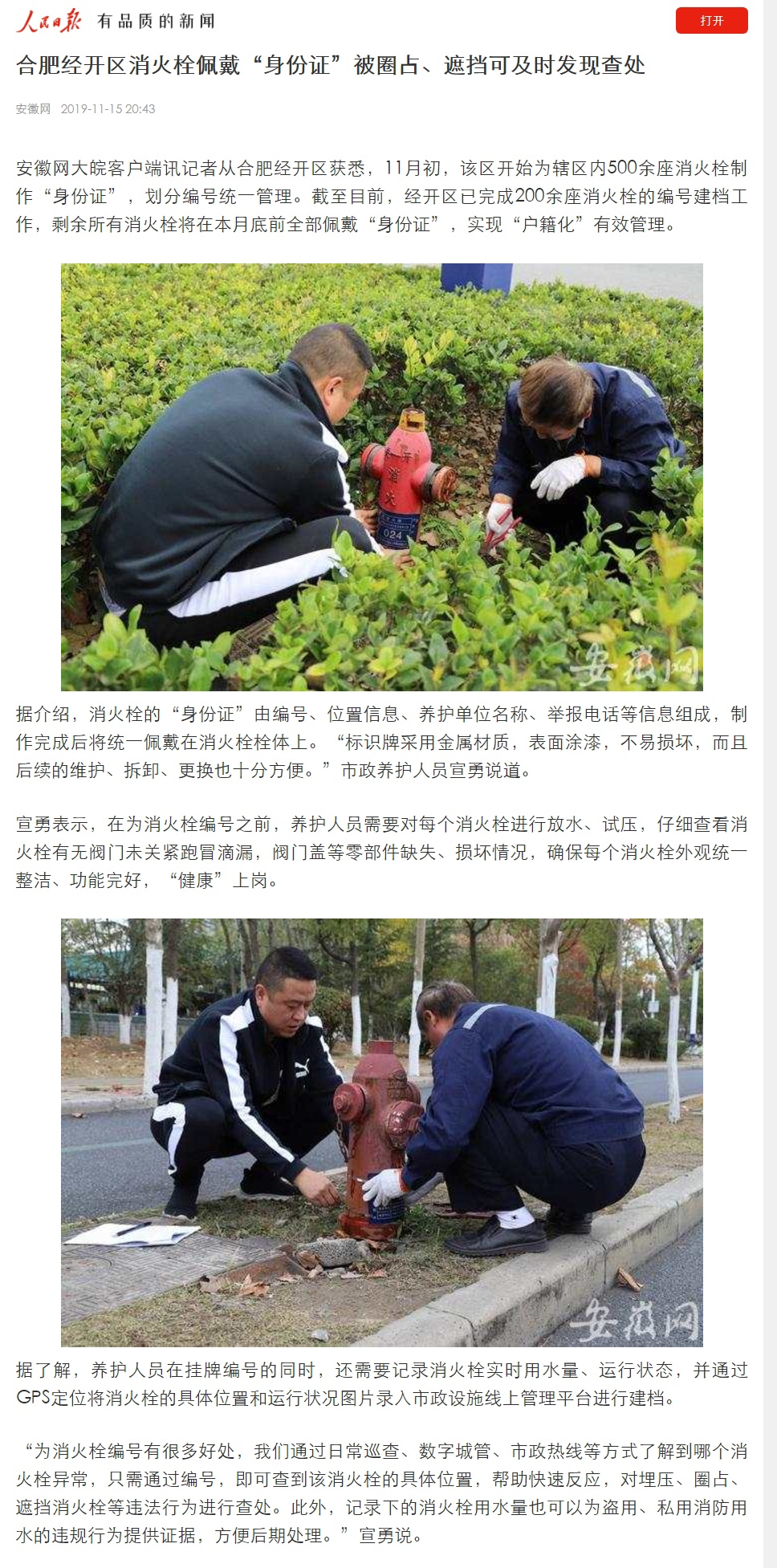 安徽网、合肥在线:合肥经开区消火栓佩戴“身份证”被圈占、遮挡可及时发现查处