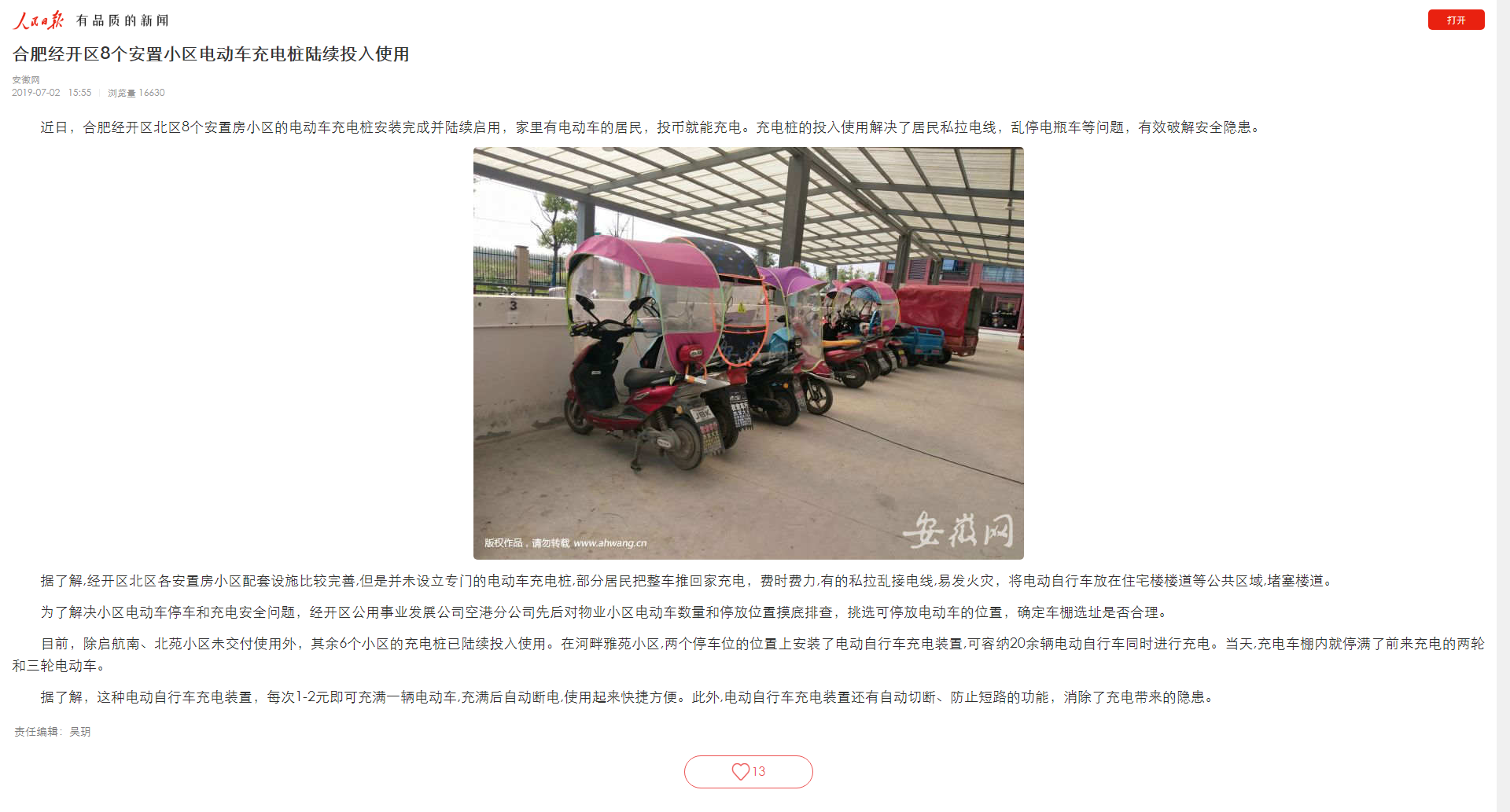 人民日报客户端、合肥晚报、安徽网:安置房小区建设户外充电桩 拒绝电瓶车进楼栋